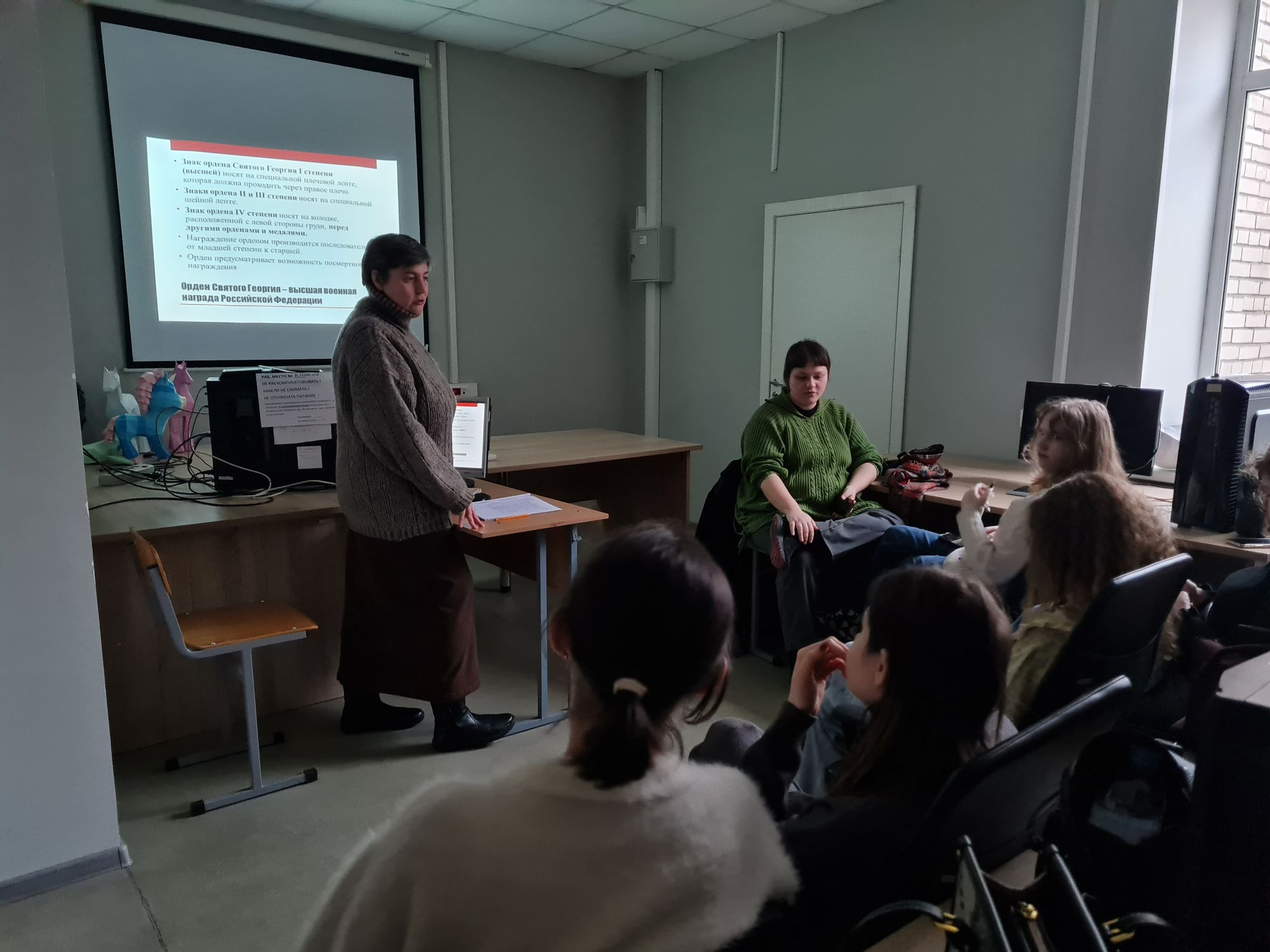 На кафедре анимации и медиадизайна студентам была показана презентация об истории этой памятной даты, связанной с учреждением в России ордена Святого Георгия Победоносца (в 1796 году). Рассказано о кавалерах этого ордена, в частности – о единственной женщине, получившей эту награду в годы Первой Мировой войны (посмертно) за подвиг сестры милосердия – Римме Ивановой. О традициях советского аналога ордена Святого Георгия – ордене Славы. В беседе студентам было предложено вспомнить героев, чьи подвиги им наиболее памятны: прозвучали имена героев Великой Отечественной войны – Зои Космодемьянской, Алексея Гарькавого, Владислава Хрустицкого; советских военачальников маршала Г. К. Жукова и маршала В. И. Чуйкова. Из героев древней истории Руси – Святого благоверного князя Александра Невского. Студенты вспомнили и своих родственников, принимавших участие в Великой Отечественной войне. В беседе была затронута и тема современности, вспомнена крылатая фраза «из одного металла льют медаль за бой, медаль за труд».