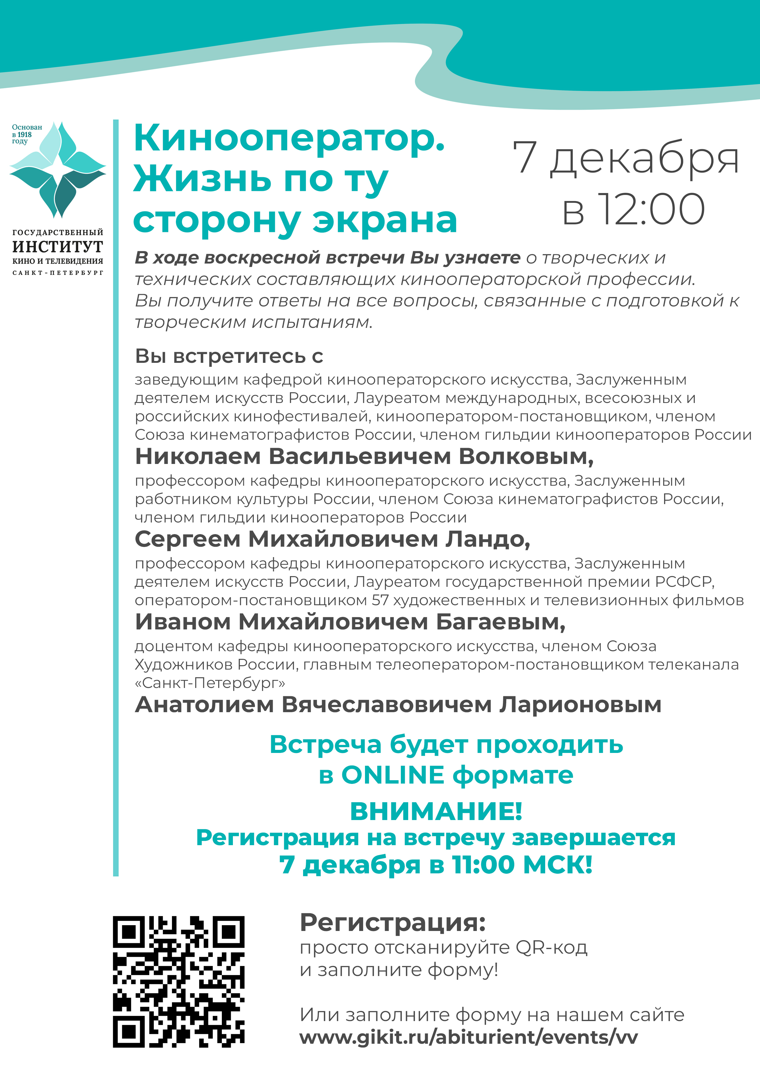 7 декабря в 12:00 (ОНЛАЙН МЕРОПРИЯТИЕ) - «Кинооператор. Жизнь по ту сторону экрана»
