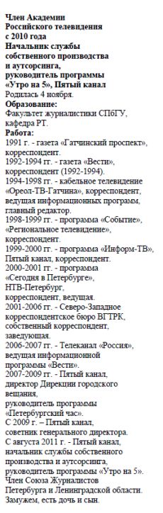 «В Петербурге действительно плохо с телевизионным рынком. Работать здесь негде. Причем ситуация парадоксальная. Работодателям некого брать на работу, потому что уровень профессиональный очень упал. Если ты новостной человек, то у тебя есть хоть какой-то шанс. Особенно мальчики, их всегда не хватает. А если ты снимаешь документальные фильмы, а если ты придумал программу игровую, а если у тебя дар интервью, то «Пятый канал», телеканал «100» , канал «Санкт-Петербург» - все, здесь больше нет ничего. В Москву все едут, и все устраиваются. Самое смешное, что те люди, которые в наших командах были признаны профессионально непригодными – вылетали через неделю–две, зато они прекрасно устраиваются в Москве да кочуют из редакции в редакцию, но, тем не менее, никто не пропадает с голоду. Тем более, в резюме всегда можно переврать: недавно я получила резюме от режиссера трансляции «Алых парусов», человек ходит и отправляет всем».