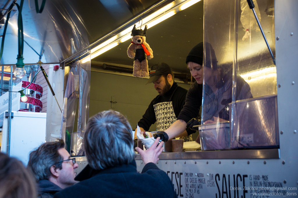 На небольшой площади, рядом с дворцом Берлинале и другими кинотеатрами, расположились фургончики с местной едой, где проголодавшиеся зрители могли попробовать блюда немецкой кухни