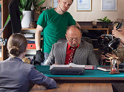 (Юрий Гальцев повторяет текст на съемочной площадке фильма нашего выпускника)
