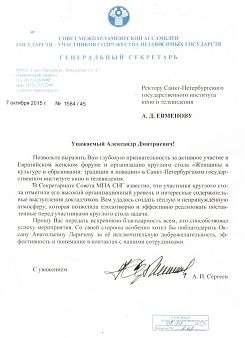 Генеральный секретарь Совета Межпарламентской ассамблеи государств — участников СНГ Алексей Иванович Сергеев отмечает в своем письме, что ректору Института удалось создать теплую и непринужденную атмосферу, которая позволила плодотворно и эффективно реализовать поставленные перед участниками круглого стола задачи, а также передает искреннюю благодарность всем, кто способствовал успеху мероприятия.