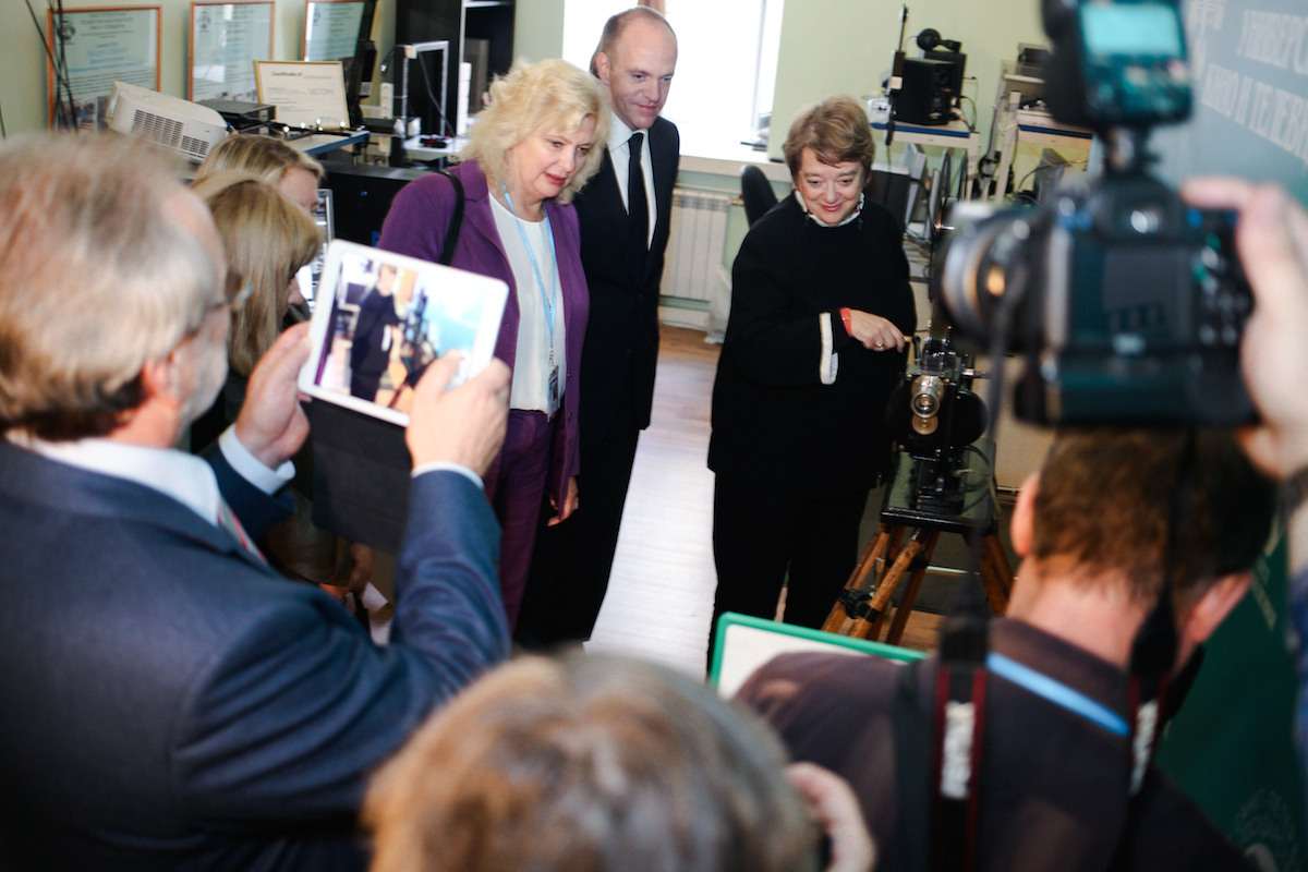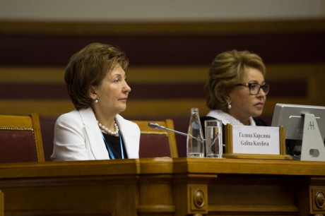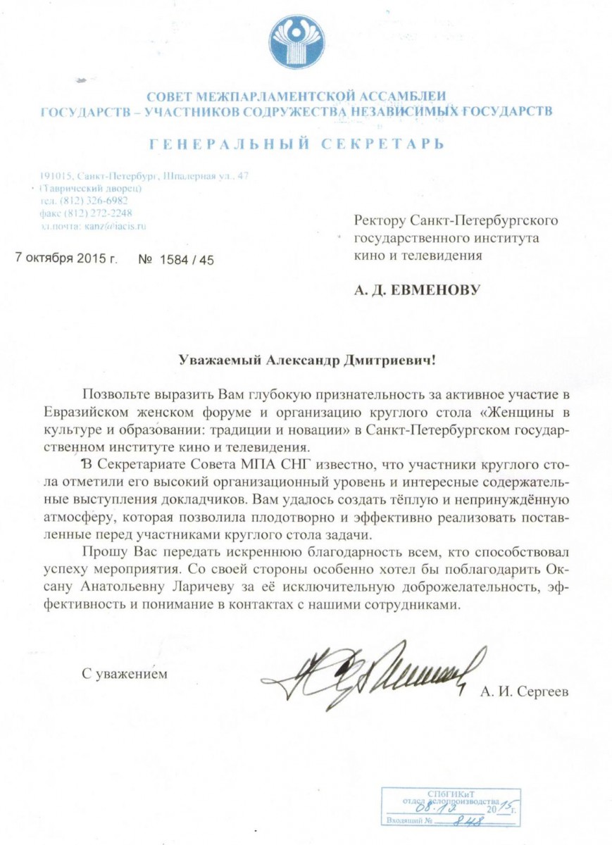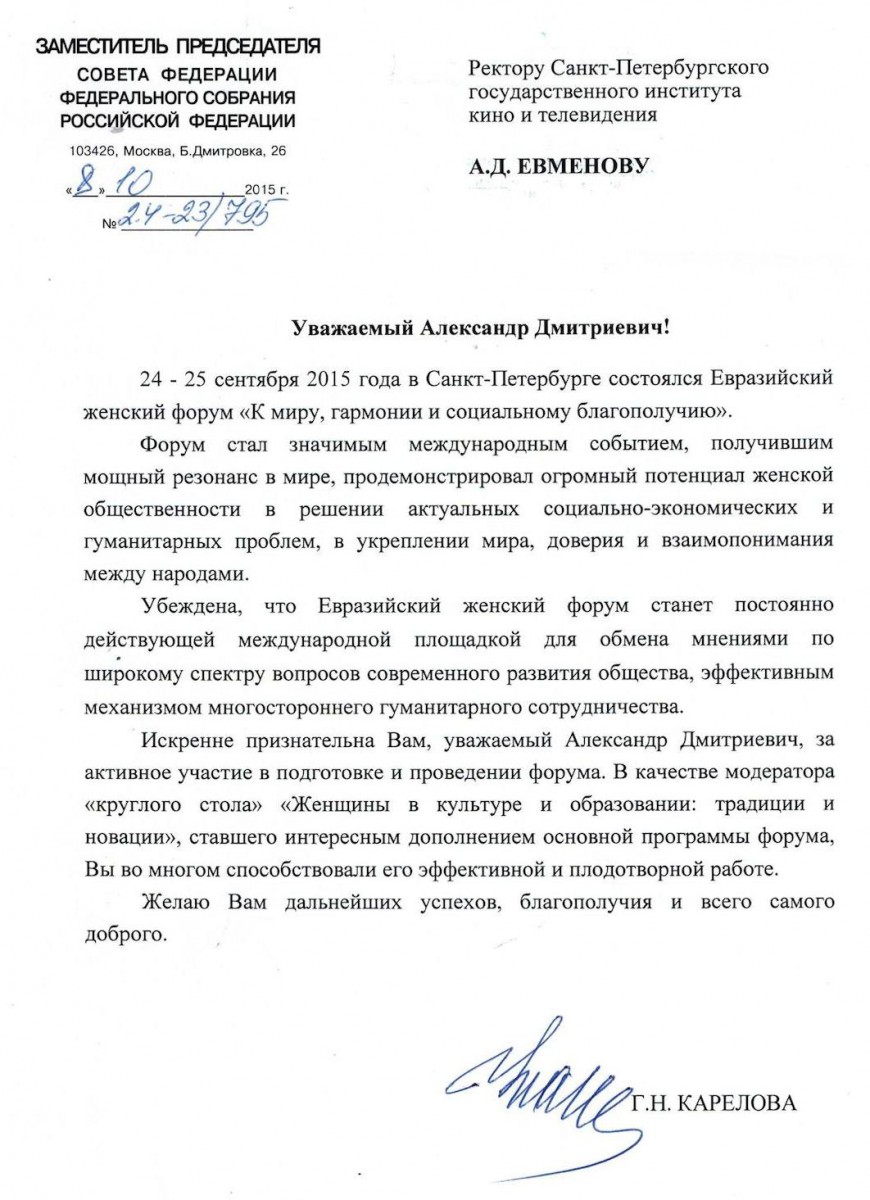 Заместитель председателя Совета Федерации Галина Николаевна Карелова и Генеральный секретарь Совета Межпарламентской ассамблеи государств — участников СНГ Алексей Иванович Сергеев поблагодарили ректора Санкт-Петербургского государственного института кино и телевидения, профессора Александра Дмитриевича Евменова за активное участие в подготовке и проведении Евразийского женского форума