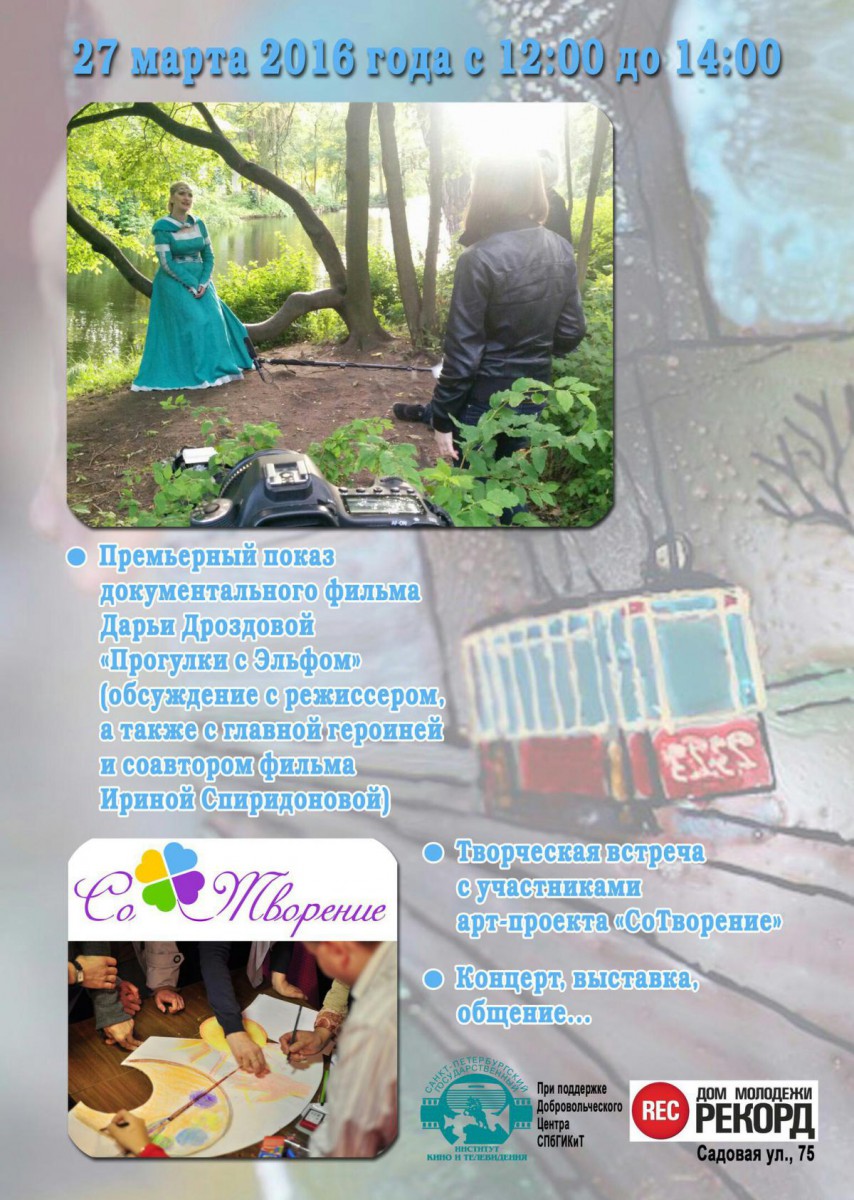 В солнечное воскресенье 27 марта во всем Петербурге нельзя было найти места с более теплой и доброй атмосферой, чем в Доме Молодежи «Рекорд» на Садовой улице, куда выехала команда волонтёров Добровольческого Центра СПбГИКиТ. Премьерный показ документального фильма Дарьи Дроздовой, выпускницы СПбГИКиТ и социолога отдела по воспитательной работе, в рамках Фестиваля независимого творчества "Арт Хауз" и арт-проекта «СоТворение» обещал зрителям не только приятное времяпровождение, но и маленькое путешествие в сказочный мир.