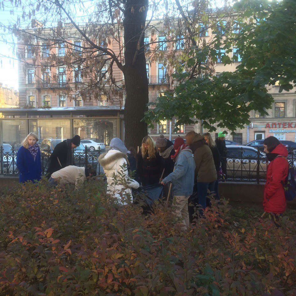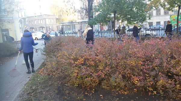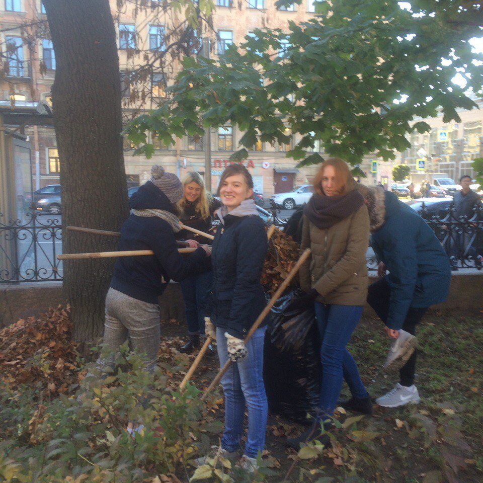 19 октября студенты первокурсники отлично поработали - очистили от листвы и мусора территорию сквера на углу улиц Звенигородской и Марата!