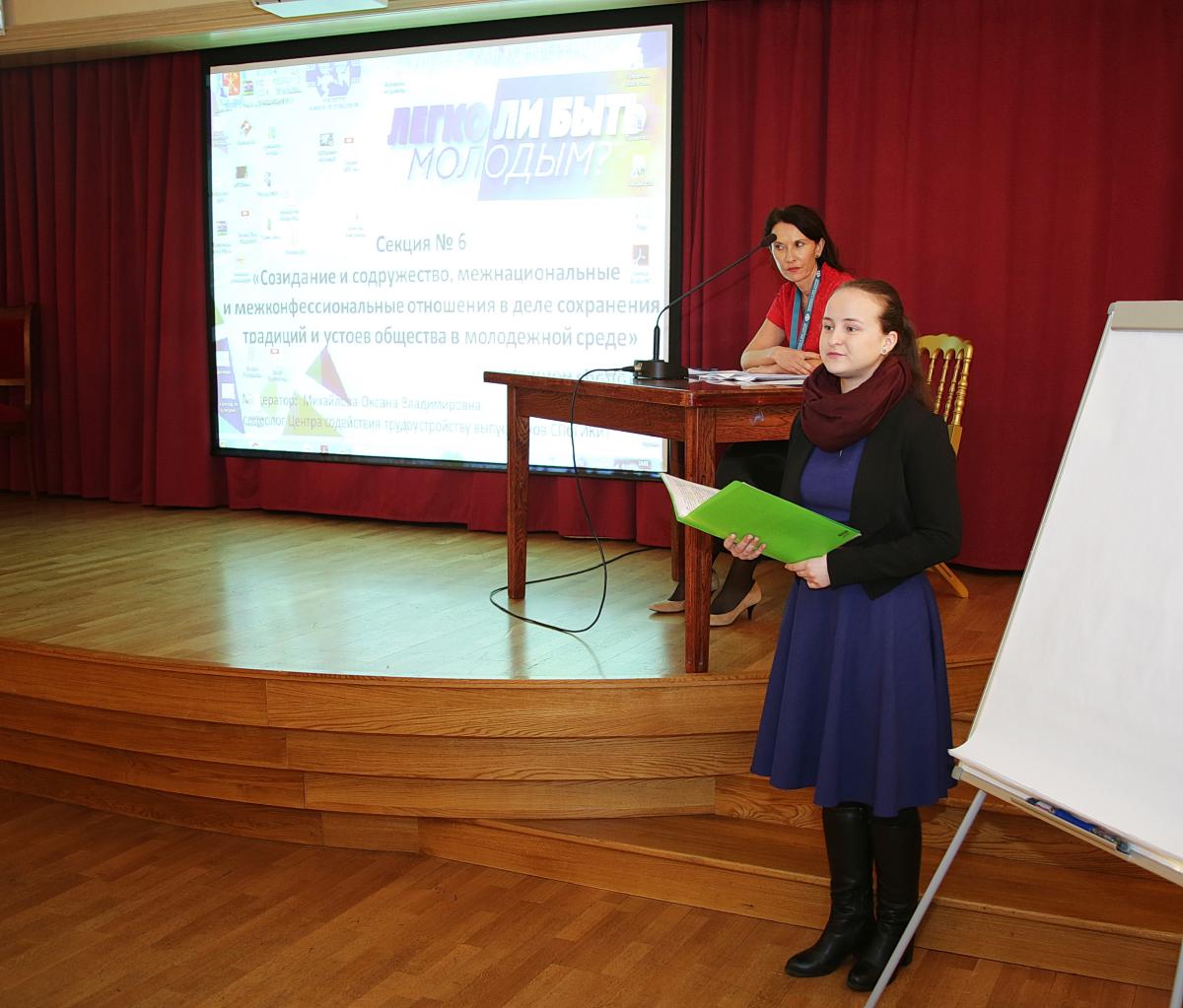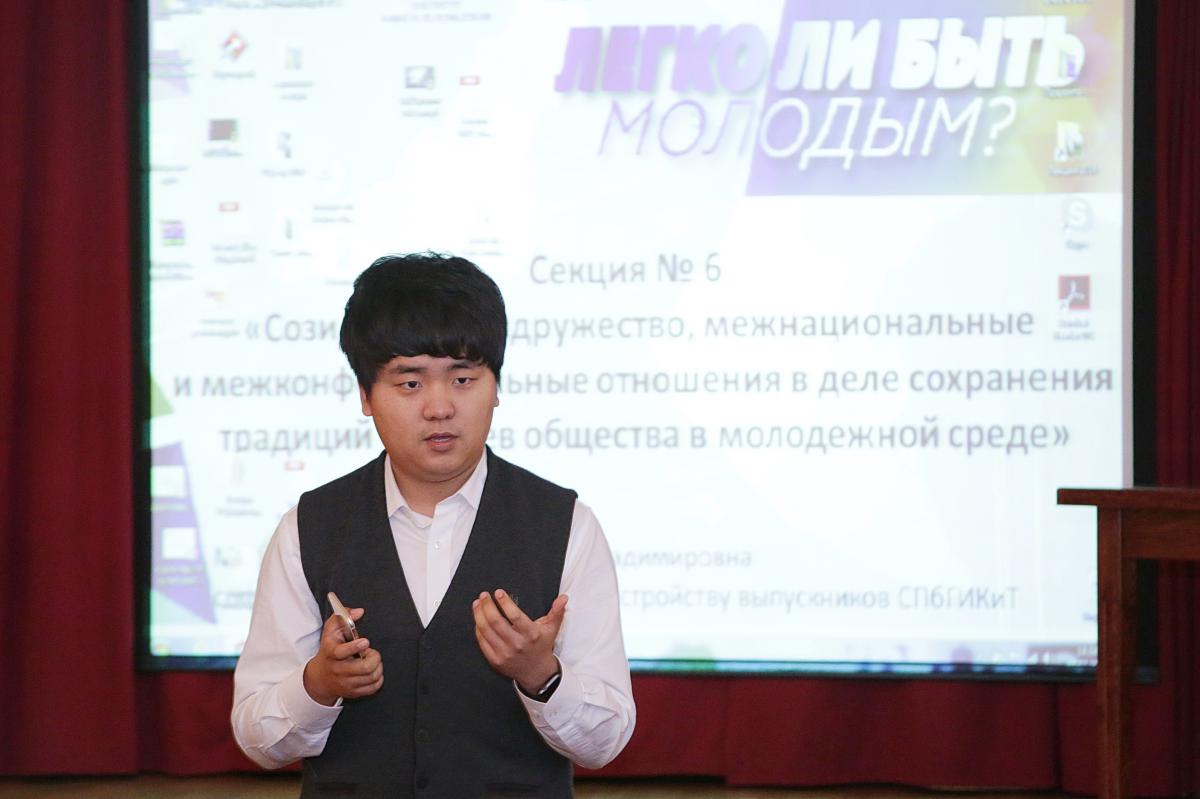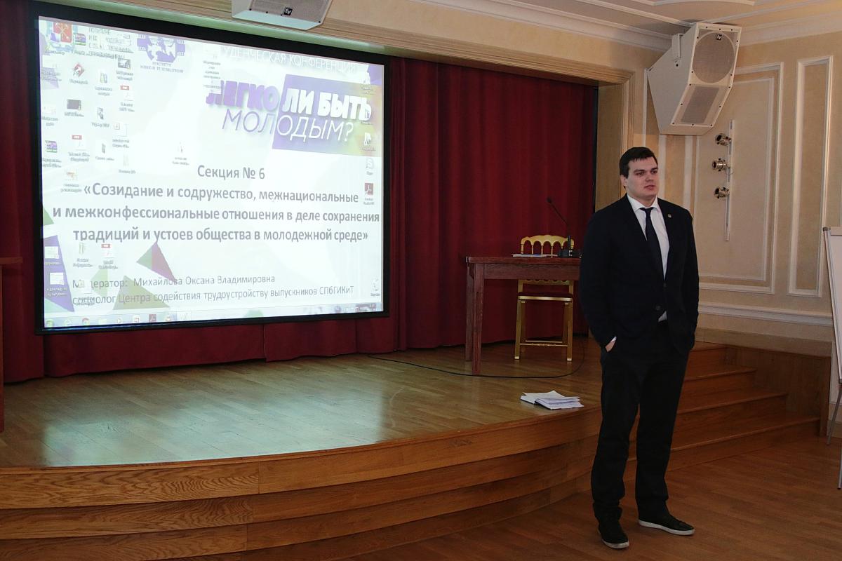 Одна из секций была посвящена «Созиданию и содружеству, межнациональным отношениям в деле сохранения традиций и устоев общества в молодежной среде». Слушатели, докладчики и эксперты рассуждали на темы экстремизма и межконфессиональных отношений, о падении культурного уровня народностей и о конфликтах национальностей. Студенты презентовали свои общественные движения и организации, говорили о проектах и мастер-классах, проводимых в таких культурных центрах, как музей истории религии, ассоциация «Покров», Российский конгресс народов Кавказа в Санкт-Петербурге, Дом национальностей, Корейский институт и др. Вместе с экспертами Иваном Игоревичем Есиповым, руководителем молодежного совета Дома Национальностей, председателем совета Евразийской молодежной ассамблеи, и Татьяной Михайловной Пчелянской, заместителем директора по развитию Государственного музея истории религии, участники разрабатывали предложения для Комитета по молодежной политике и Комитета по межнациональным отношениям.