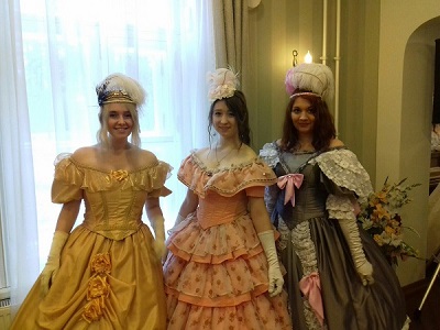 Благодаря опытным мастерам наши студентки перевоплотились в изящных модниц XIX века, примерив стилизованное историческое платье той эпохи. Распорядитель бала познакомил участниц костюмированного действия с принятым на придворных балах этикетом и правилах поведения на балу.