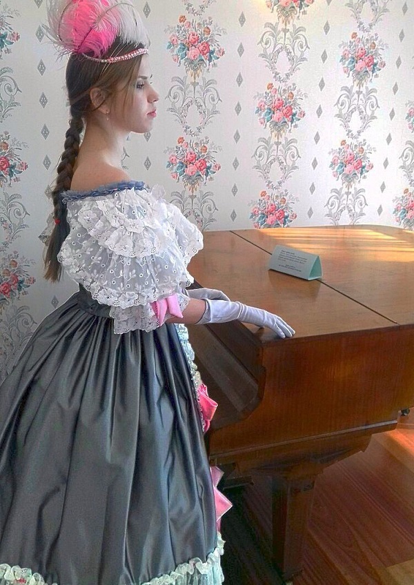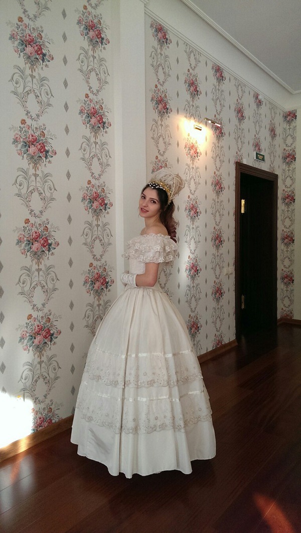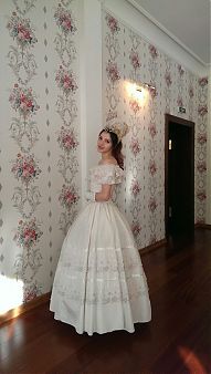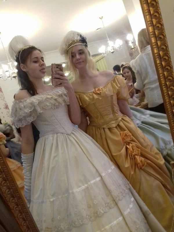 Благодаря опытным мастерам наши студентки перевоплотились в изящных модниц XIX века, примерив стилизованное историческое платье той эпохи. Распорядитель бала познакомил участниц костюмированного действия с принятым на придворных балах этикетом и правилах поведения на балу.