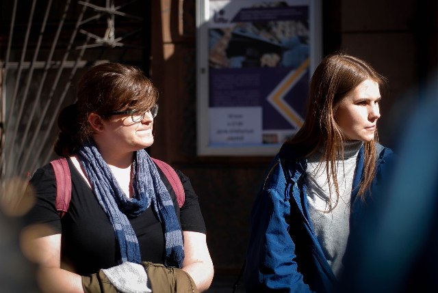 Знакомство студентов Института с их заокеанскими сверстниками состоялось возле памятника Организатору, находящемуся напротив входа в главное здание. Буквально через несколько минут хозяева и гости нашли общий язык и отправились на совместную экскурсию по учебным аудиториям и мастерским. Гидом выступила студентка кафедры журналистики Владлена Мартус, рассказавшая американским студентам об истории и дне сегодняшнем вуза.