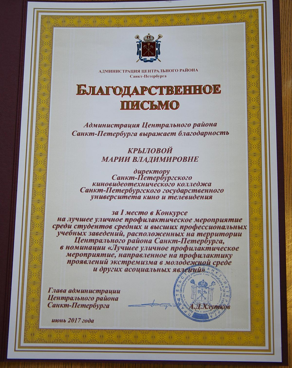 Мы поздравляем студентов Киновидеотехнического колледжа с заслуженной победой в номинации «Лучшее уличное профилактическое мероприятие, направленное на профилактику проявлений экстремизма в молодежной среде и других асоциальных явлений» и желаем им новых успехов – как в учебе, так и в общественной жизни.