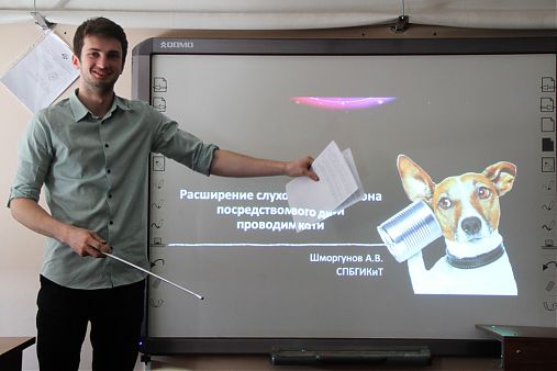Его товарищами «по цеху» стали Наталья Дерябина и Александр Нейленко, представившие вниманию присутствующих виртуальный 3D тур по кафедре киновидеоаппаратуры, выполненный с помощью этой панорамной головки. Этот проект можно с уверенностью считать интересным и успешным, поскольку открывающаяся любому желающему возможность заочно познакомиться с аудиториями института – настоящий подарок не только абитуриентам, но и тем, кто скучает по родным стенам.