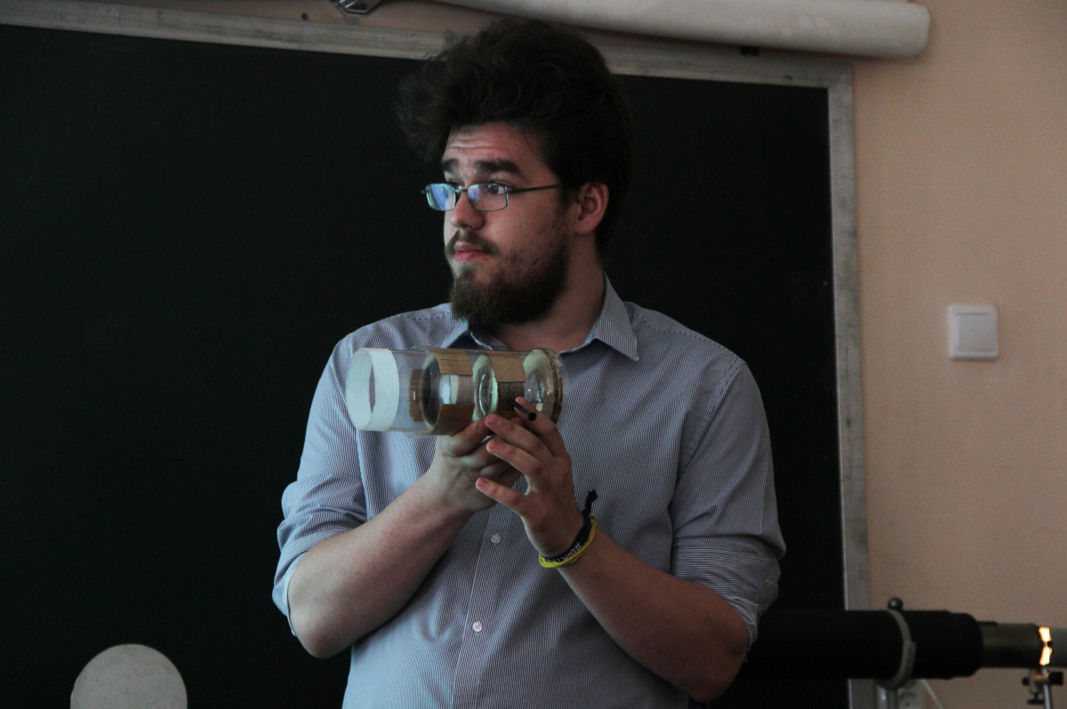 Еще одними энтузиастами «подкрепления» своего выступления собственноручно изготовленными моделями стали Михаил Чепкин и Даниил Абрамов, сконструировавшими демонстрационные объективы для учебных целей. Ребята, под руководством старшего преподавателя кафедры киновидеоаппаратуры Елены Юрьевны Патрикеевой, при помощи двух линз и пластиковых бутылок (!!!) создали два аналога оптических систем.