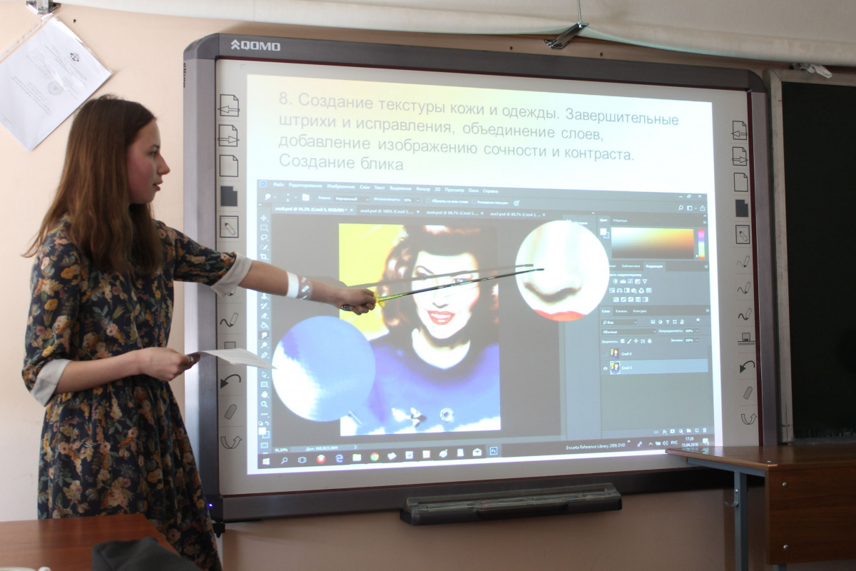 Далее мы знакомились с трудами других докладчиков, а в конце заседания подсекции студенты 1 курса нового профиля подготовки «Технологии кино и телевидения» Екатерина Бурундукова и Татьяна Тарасова в своих работах поделились алгоритмами и способами взаимодействия с Adobe Photoshop при создании портрета и «эффекта дождя».