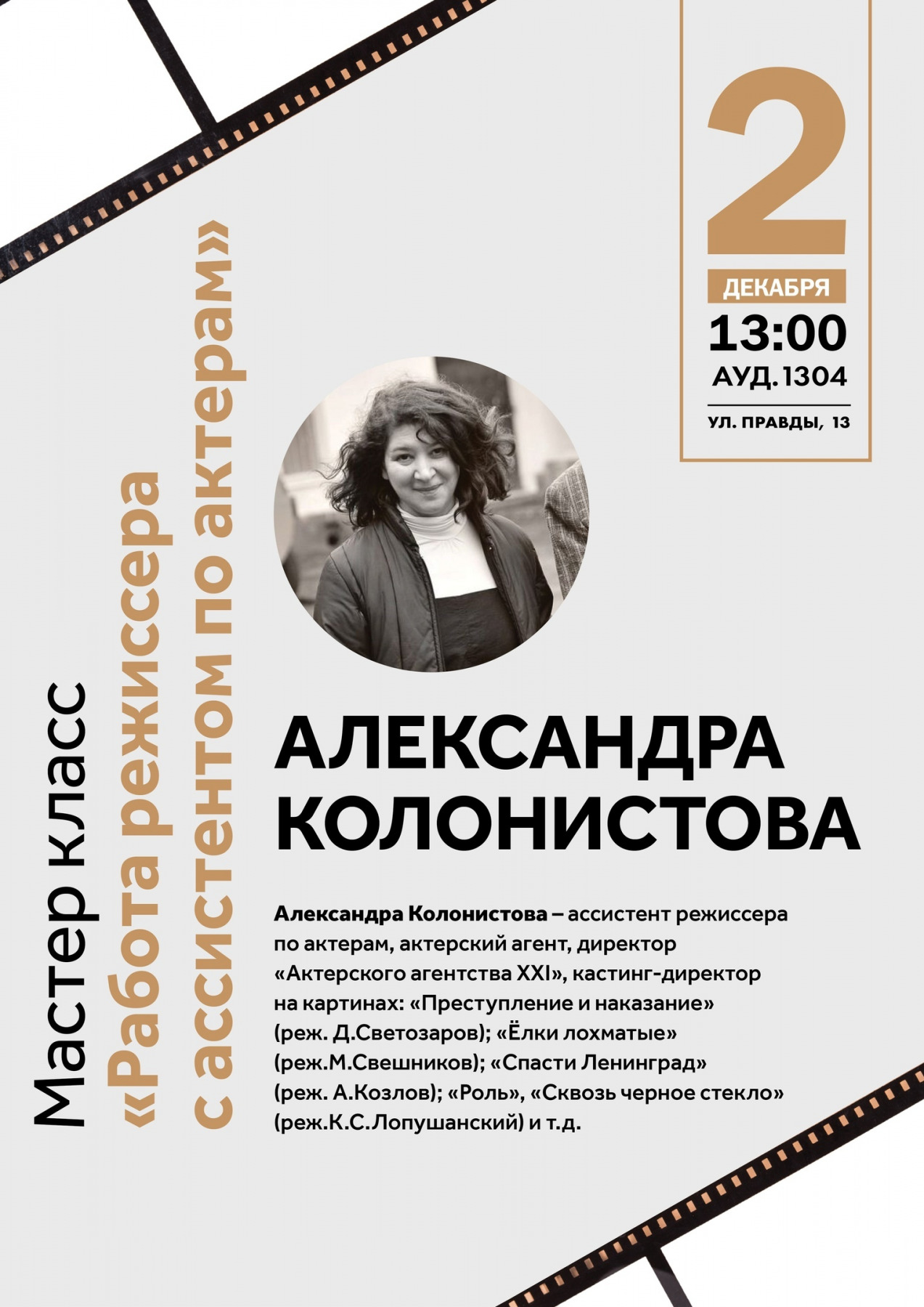 Александра Колонистова – ассистент режиссера по актерам, актерский агент, директор «Актерского агентства XXI», кастинг-директор на картинах: «Преступление и наказание» (реж. Д.Светозаров); «Ёлки лохматые» (реж.М.Свешников); «Спасти Ленинград» (реж. А.Козлов); «Роль», «Сквозь черное стекло» (реж. К.С.Лопушанский) и т.д. имеет колоссальный опыт работы с разными режиссерами.