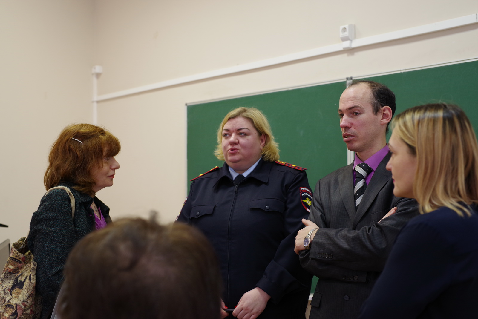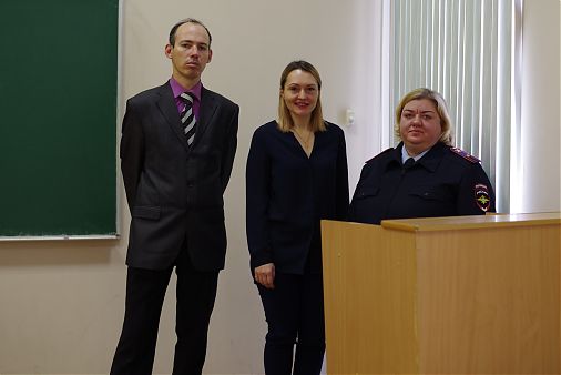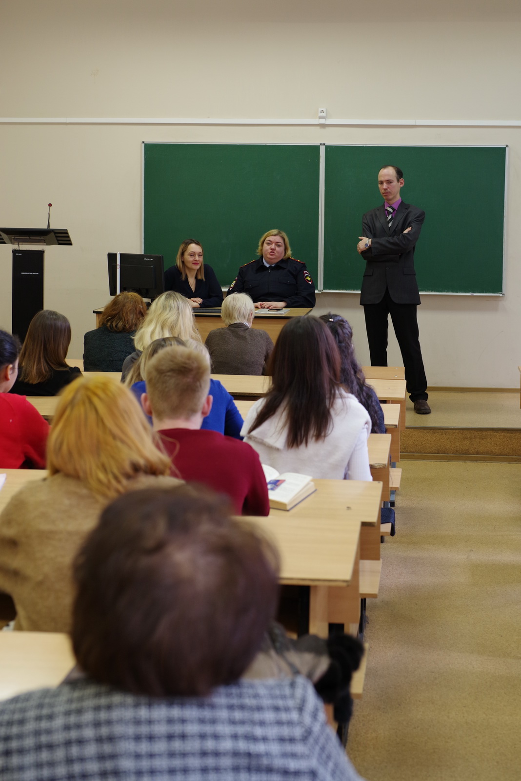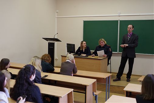 6 марта в аудитории 1313, при участии кафедры иностранных языков, прошла встреча студентов первого курса СПбГИКиТ со специалистом по социальной работе с молодежью Новиковым Валерием Николаевичем (СПб ГБУ Городской центр социальных программ «Контакт») и старшим инспектором по делам несовершеннолетних, майором полиции Андреевой Екатериной Витальевной (УМВД России по Центральному району СПб). Встреча была организована доцентом кафедры иностранных языков Анной Николаевной Ткачевой