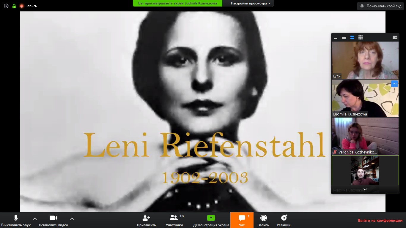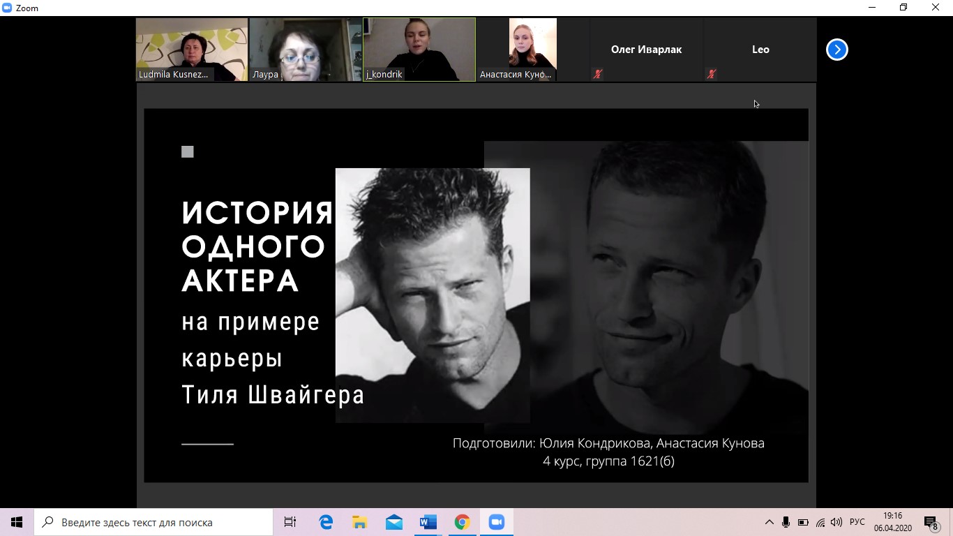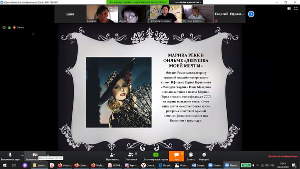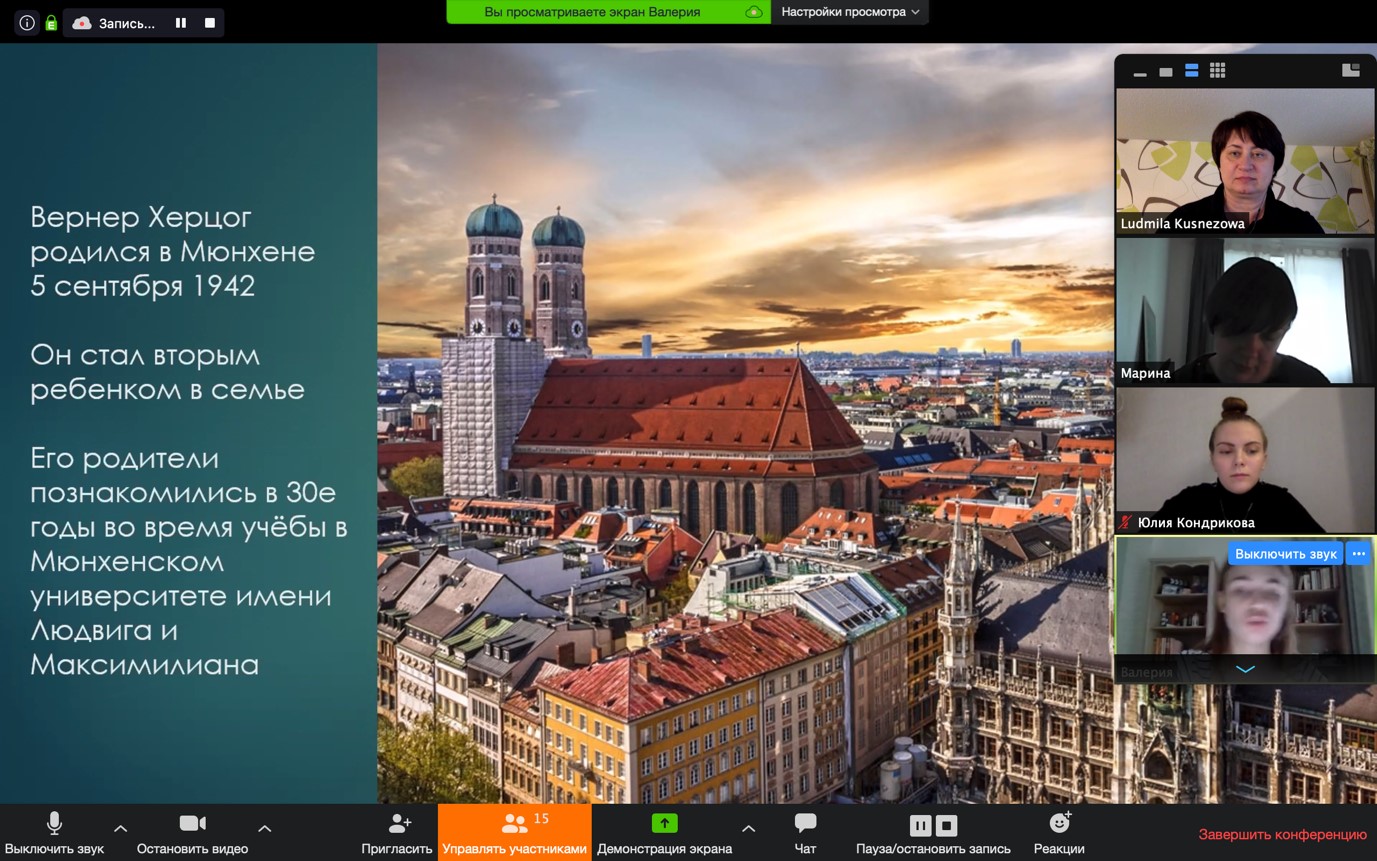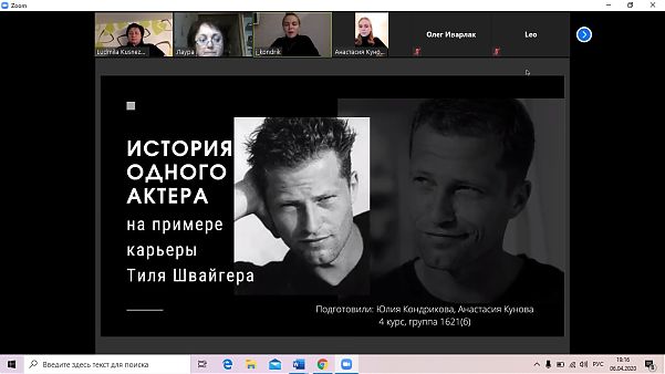 06 апреля 2020 года при поддержке специалиста отдела СДО ГИКиТ Александра Кофанова кафедра организовала студенческую конференцию «Немецкий кинематограф в биографиях» с использованием онлайн платформы Zoom. Участники конференции рассказывали о выдающихся личностях немецкого кинематографа от его зарождения до наших дней. Тема оказалась захватывающей, ведь изучая других, мы лучше понимаем себя.