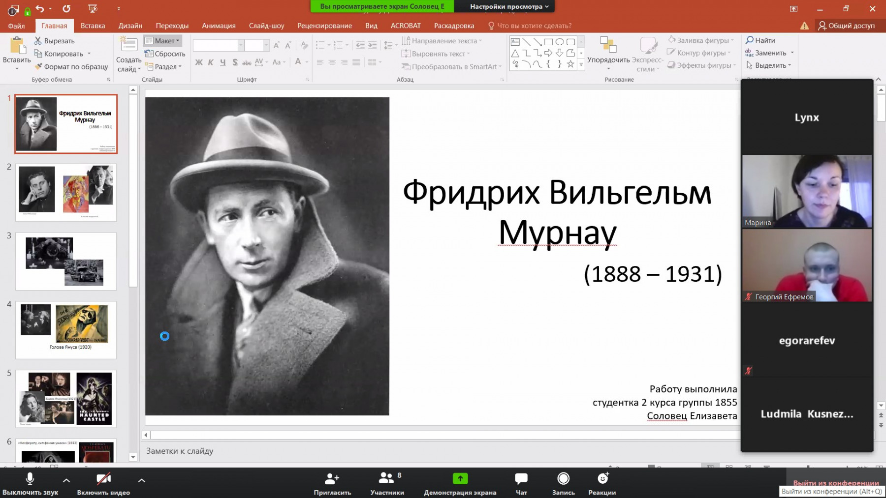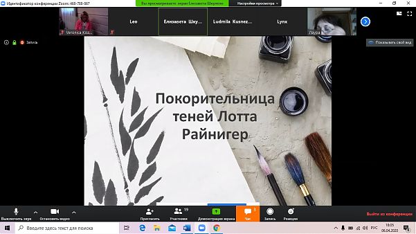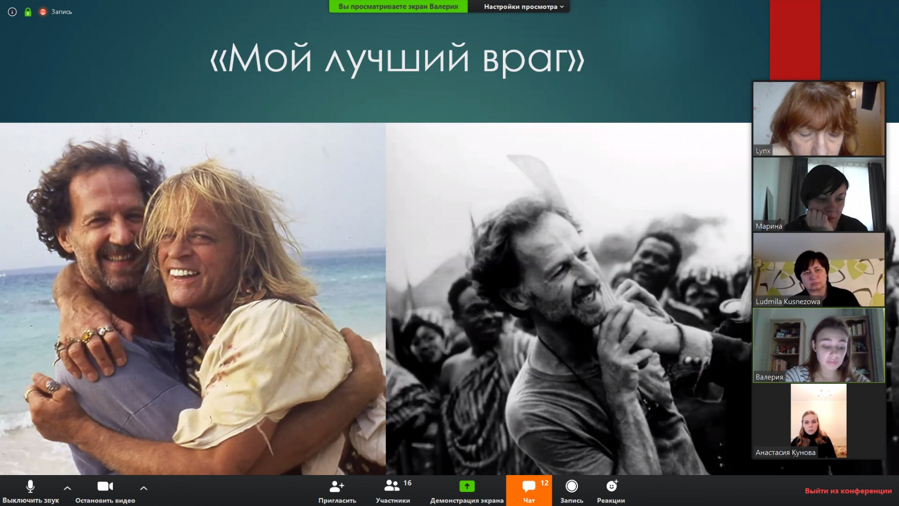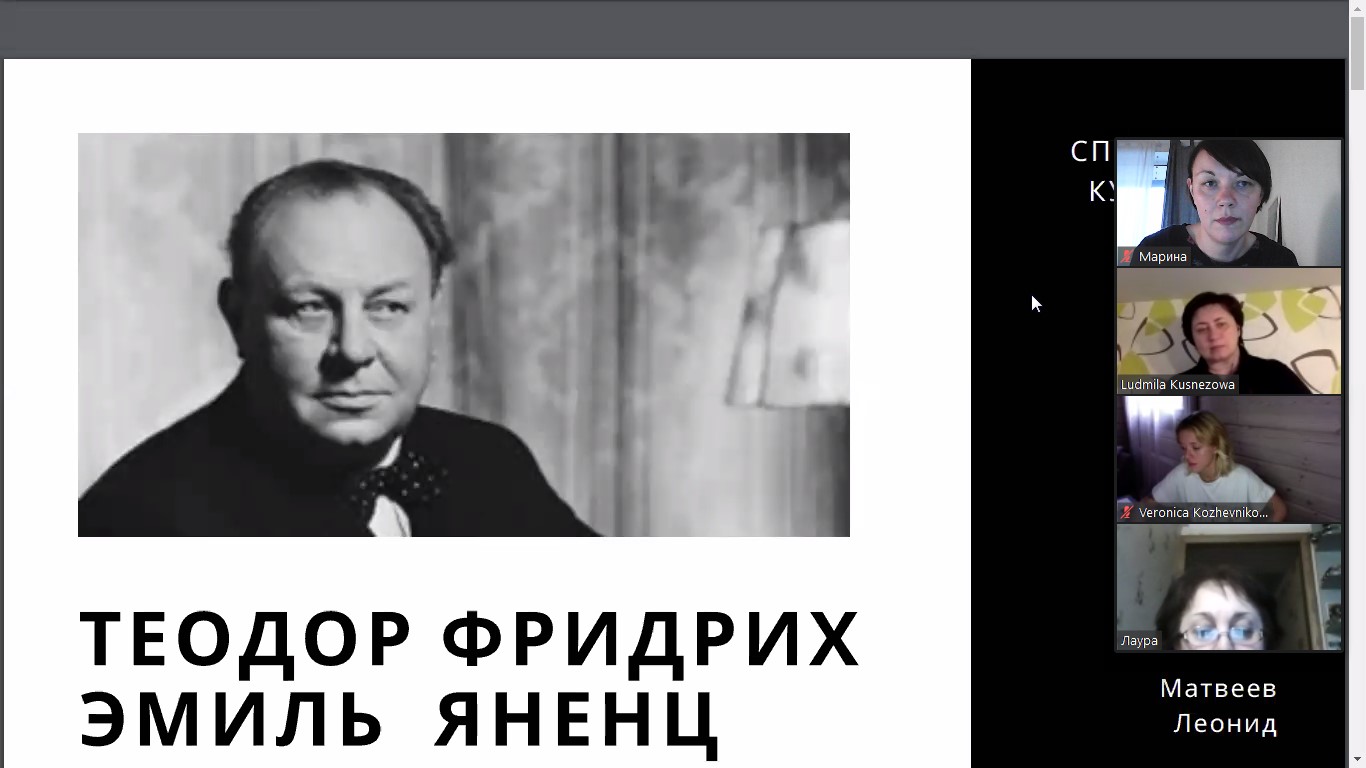 06 апреля 2020 года при поддержке специалиста отдела СДО ГИКиТ Александра Кофанова кафедра организовала студенческую конференцию «Немецкий кинематограф в биографиях» с использованием онлайн платформы Zoom. Участники конференции рассказывали о выдающихся личностях немецкого кинематографа от его зарождения до наших дней. Тема оказалась захватывающей, ведь изучая других, мы лучше понимаем себя.