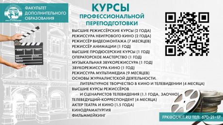 В этом году факультет дополнительного образования открывает четыре новых курса профессиональной переподготовки: «Кинодраматургия», «Звукорежиссура аудиовизуальных искусств», «Лаборатория документально-игрового кино» и «Filmmaking. Базовый курс».