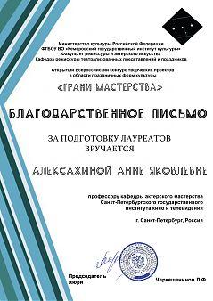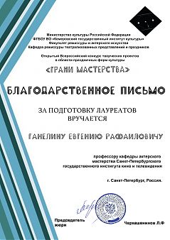 - В настоящее время, когда мы испытываем нехватку профессионального общения, творческого обмена, конкурс «Грани мастерства» стал уникальным опытом объединения единомышленников. Хочется отметить, что конкурс является настоящей творческой платформой, сплотившей специалистов в области сценической деятельности и студентов вузов искусств и культуры из всех уголков нашей страны!