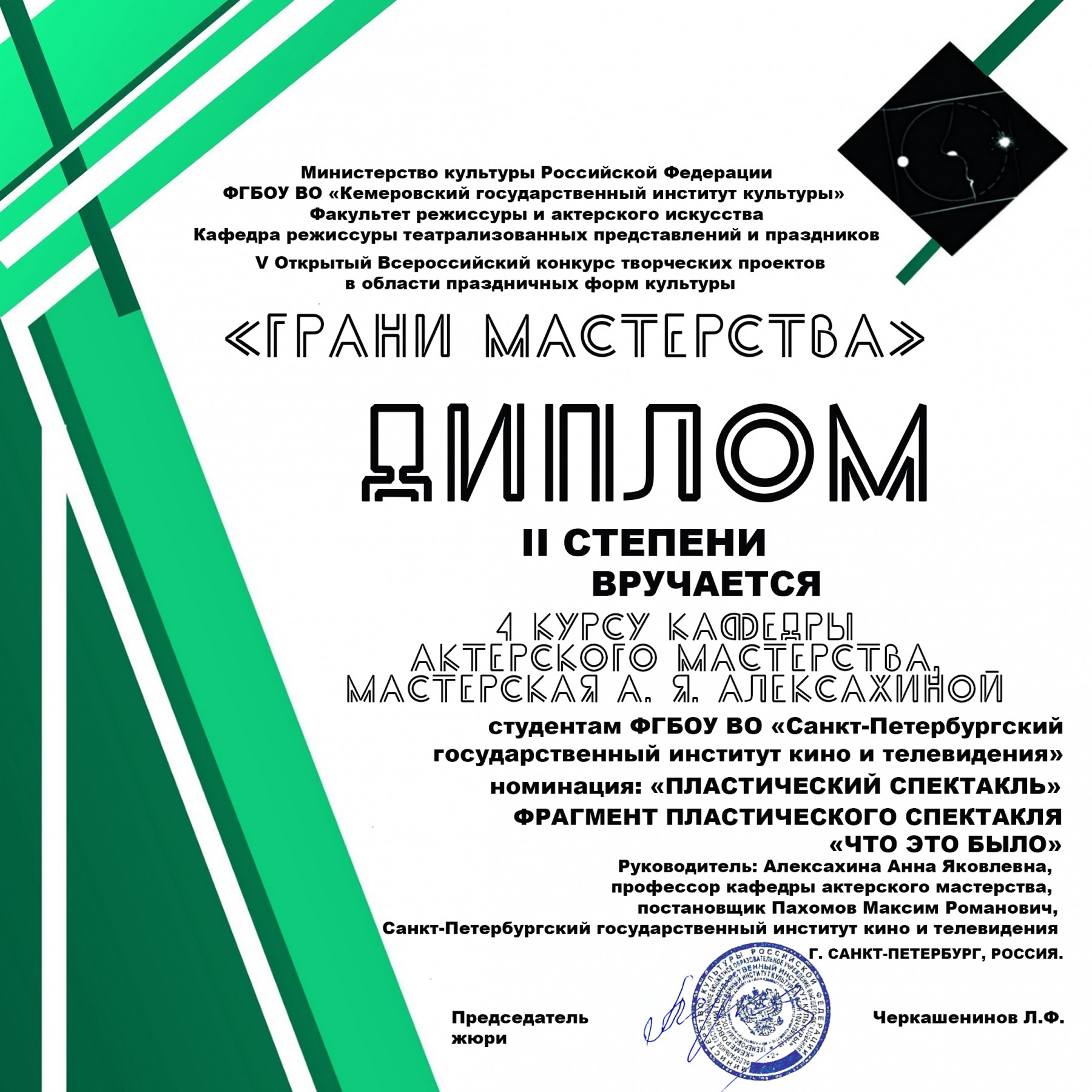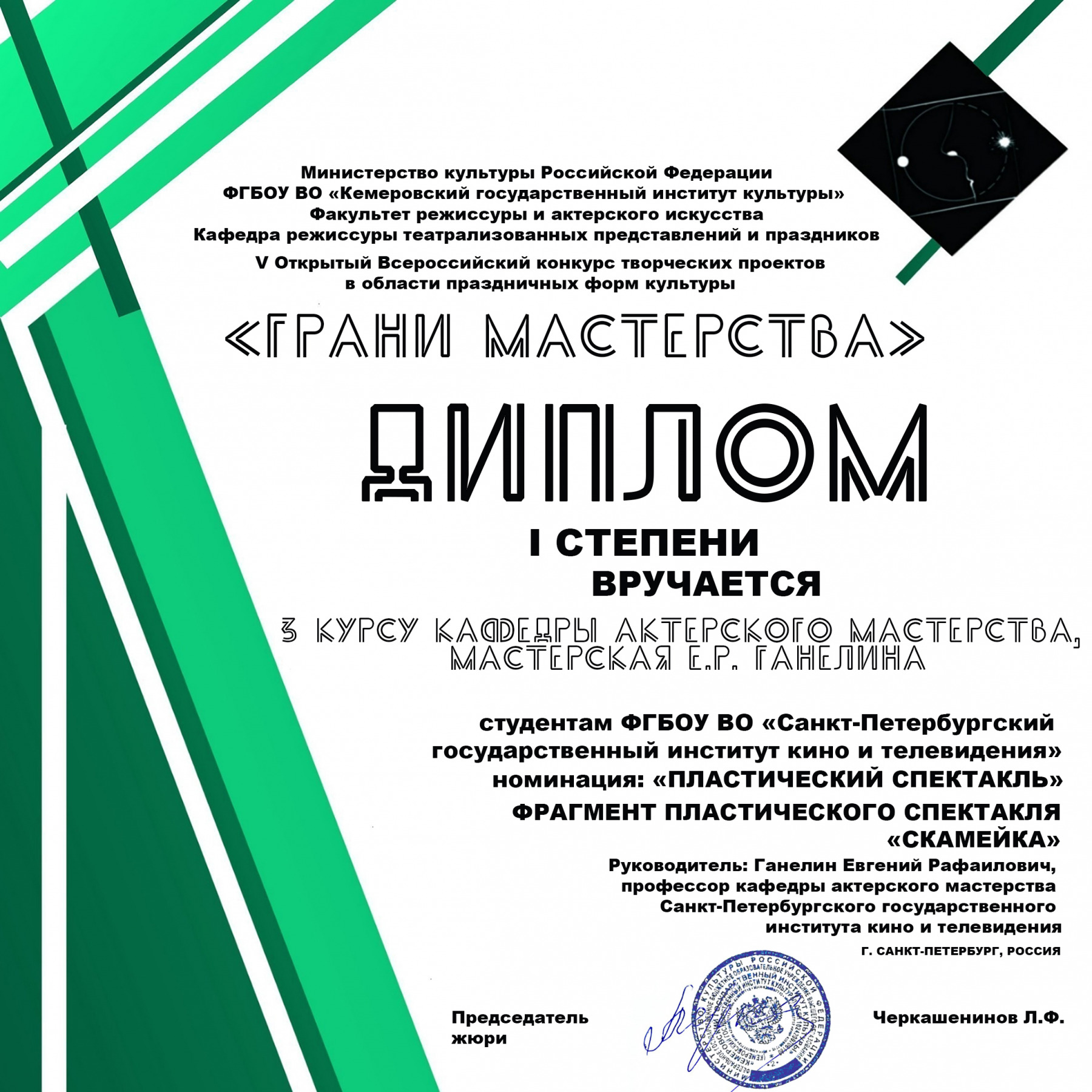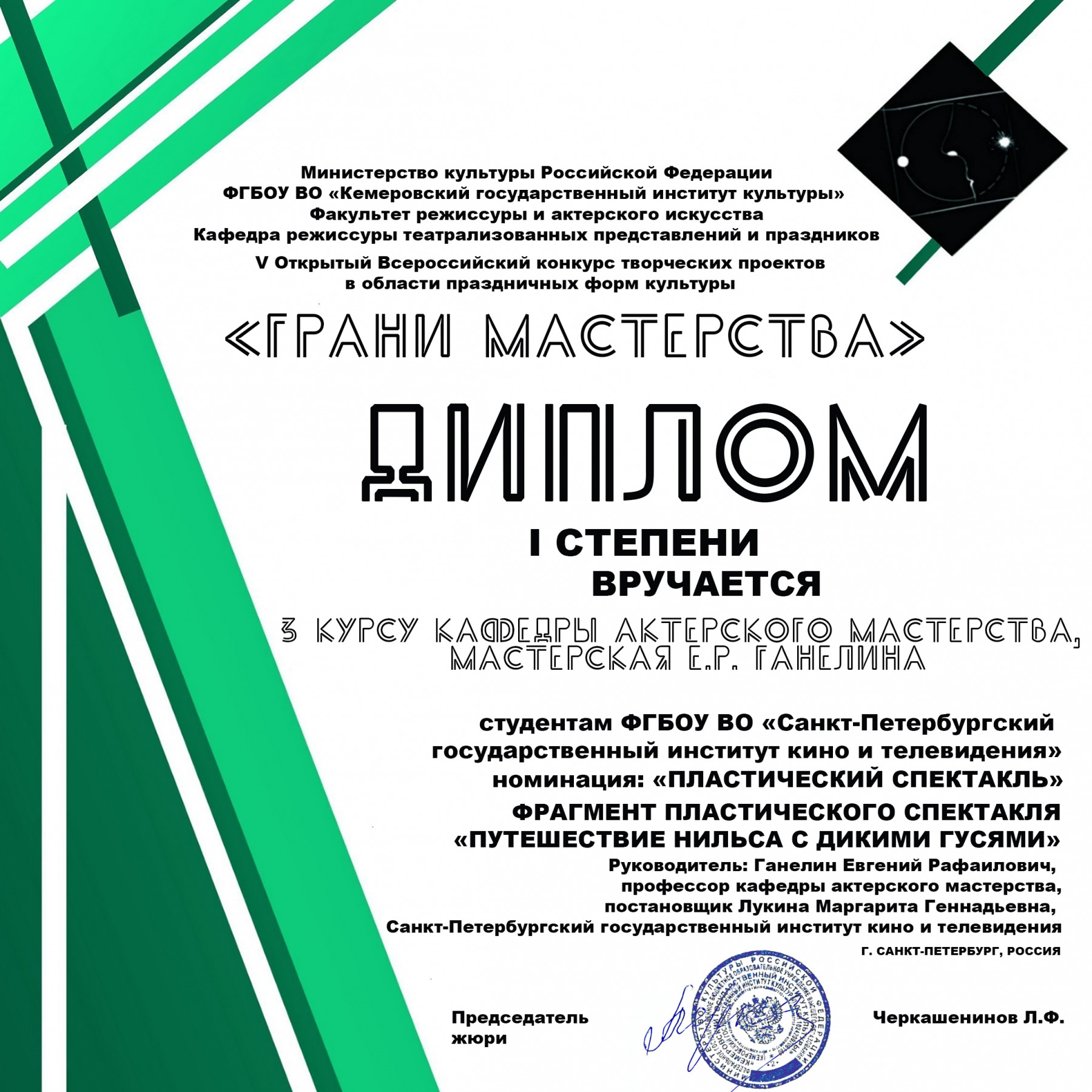 Студенты Санкт-Петербургского государственного института кино и телевидения приняли участие и победили в V Открытом Всероссийском конкурсе творческих проектов в области праздничных форм культуры «Грани мастерства». В качестве учредителей конкурса выступило Министерство культуры РФ и КемГИК. В состав жюри вошли ведущие специалисты в сфере праздничной культуры, преподаватели кафедр режиссуры, профессионалы из Москвы, Барнаула, Омска, Улан-Удэ, Перми, Челябинска, Волгограда, Белгорода и Кемерово