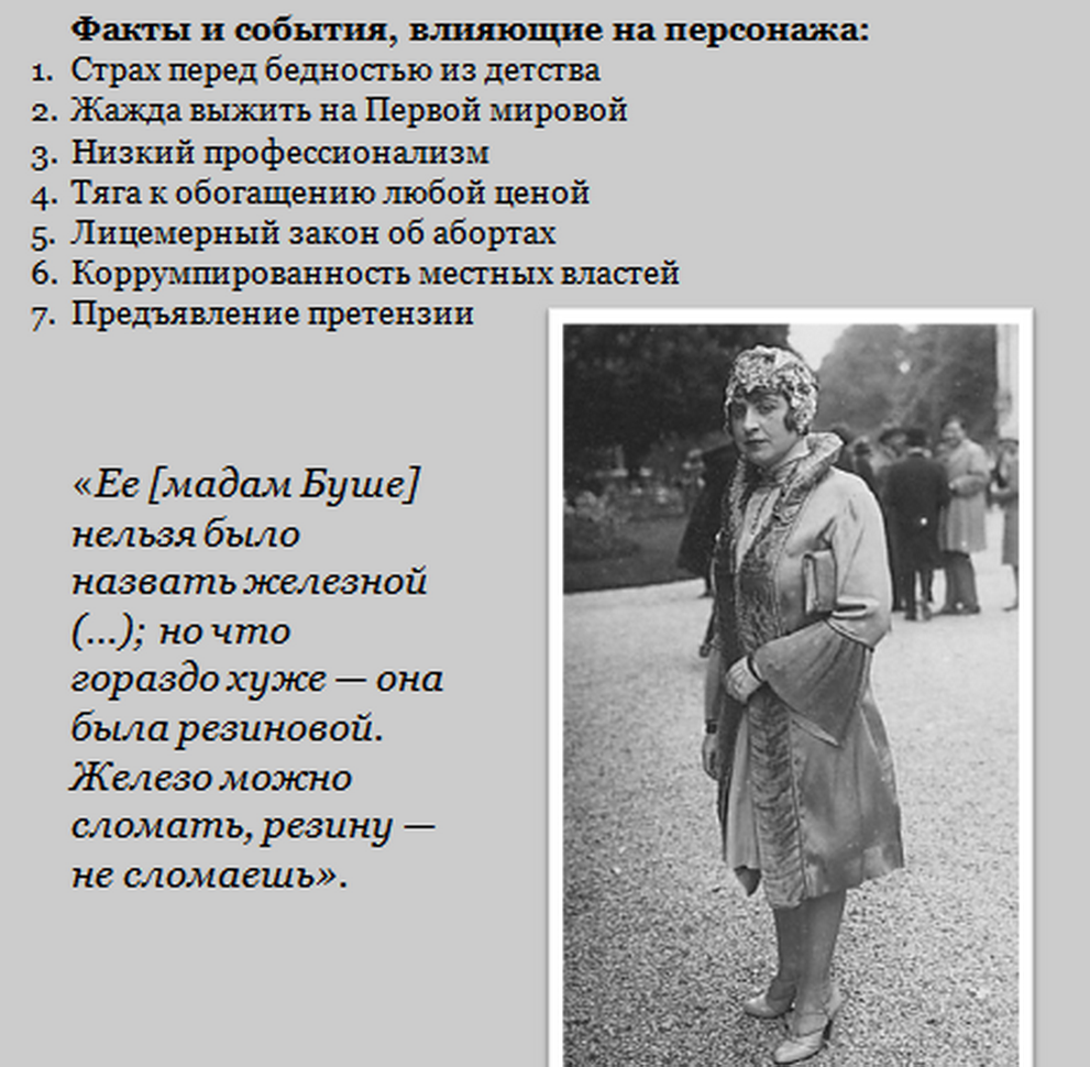 Роль Мадам Буше из произведения Эриха Марии Ремарка «Триумфальная арка»