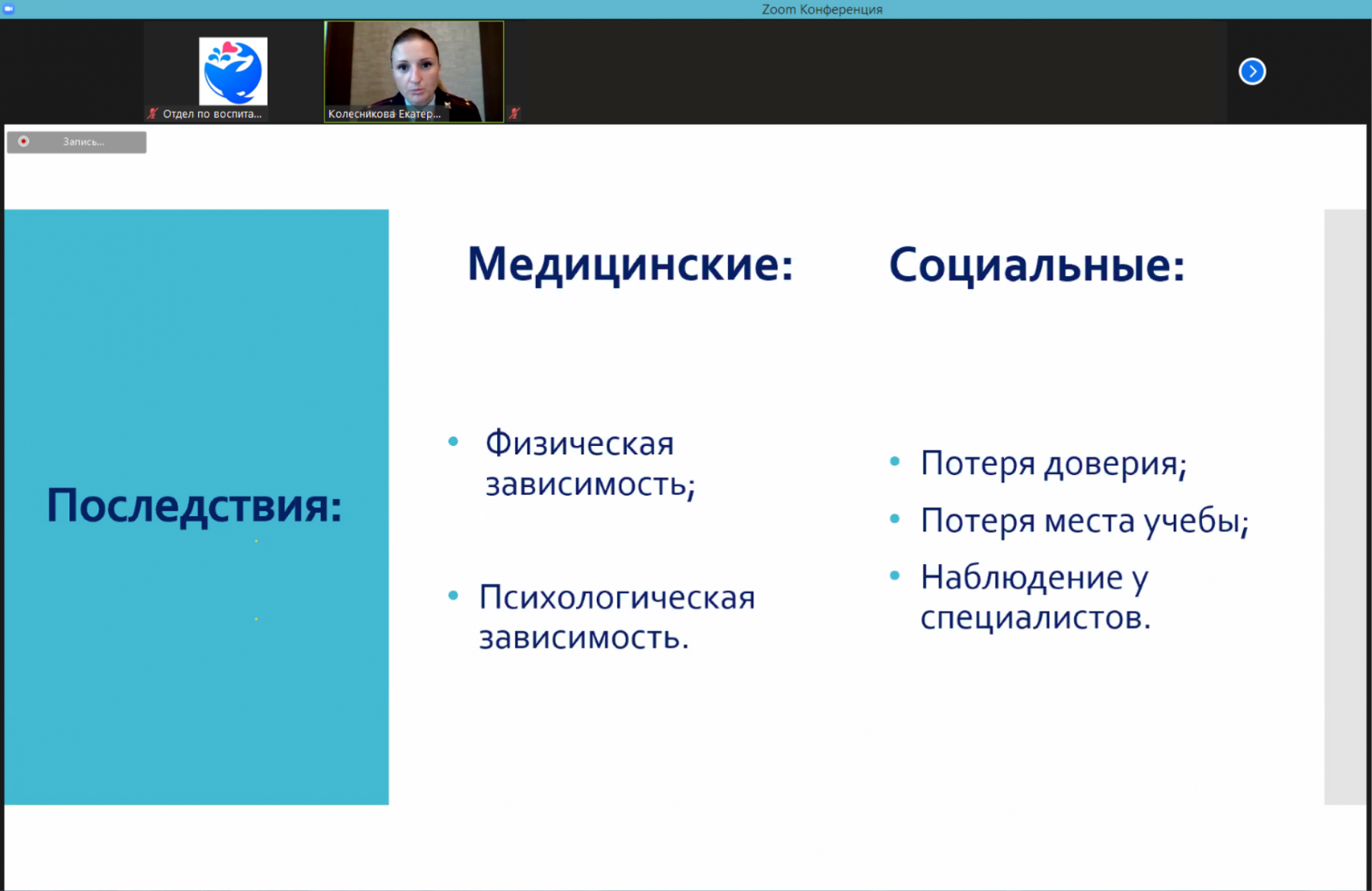 Сотрудник ГУ МВД России по г. Санкт-Петербургу и Ленинградской области Екатерина Павловна Колесникова четко разъяснила для 127 студентов-слушателей, как устроено современное законодательство РФ в сфере незаконного оборота наркотиков, какова ответственность за правонарушения в этой сфере.