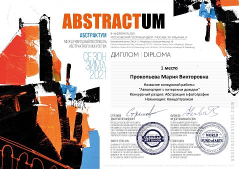 По итогам конкурса, жюри присудило М.В.Прокопьевой 1 место в номинации "Концептуализм" конкурсного раздела "Абстракция в фотографии" за авторскую фотографию "Автопортрет с питерским дождем".