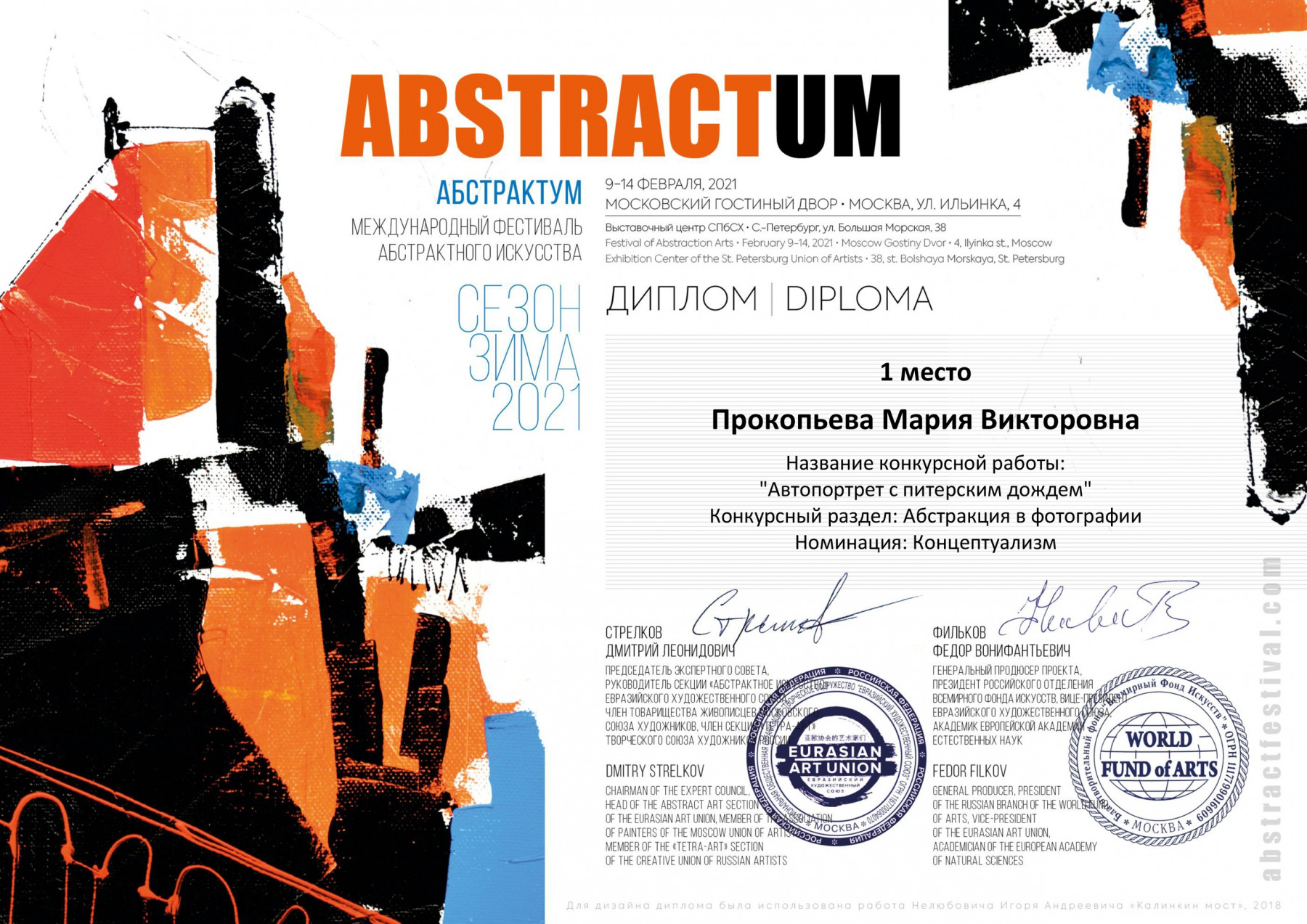 С 09 по 14 февраля 2021 года в Выставочных залах Москвы и Санкт-Петербурга был проведен Международный фестиваль-конкурс "АБСТРАКТУМ - Фестиваль Абстракции", темой которого стала "Отвлеченная реальность".