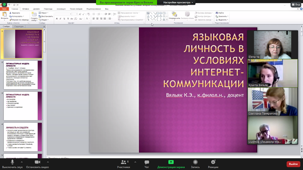Неподдельный интерес вызвала и актуальная тема представления языковой личности в киносценарии, где личность киногероя раскрывается через его поведение, речь, языковые лакуны и образность. Участниками конференции также была затронута тема языковой личности в интернет-коммуникации и, конечно же, особо внимание было уделено и языковой личности переводчика.