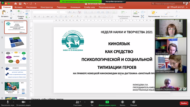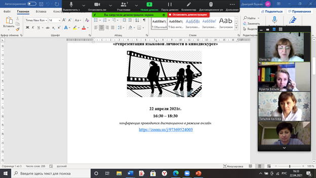 22 апреля 2021 года на кафедре иностранных языков СПбГИКиТ в дистанционном формате прошла городская научно-практическая конференция, посвященная проблемам репрезентации языковой личности в кинодискурсе.