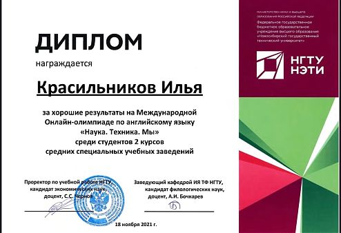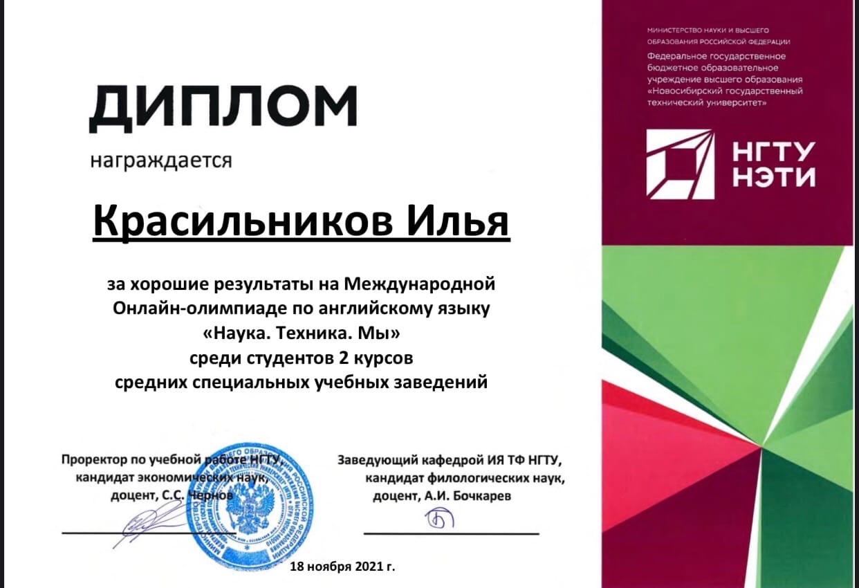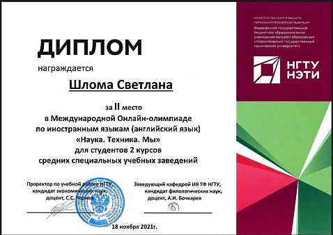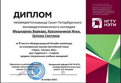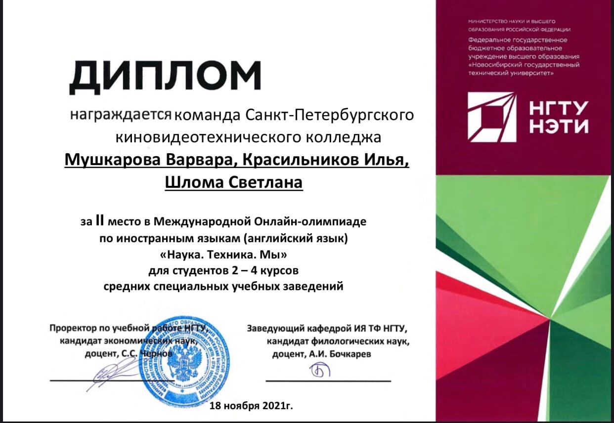 Федеральное государственное бюджетное образовательное учреждение высшего образования «Новосибирский государственный технический университет», кафедра иностранных языков технических факультетов провела Международную Онлайн - олимпиаду по иностранным языкам, в которой команда студентов Киновидеотехнического колледжа в составе Мушкаровой Варвары, Красильникова Ильи и Шломы Светланы приняла участие. Тема олимпиады - «Наука. Техника. Мы.».