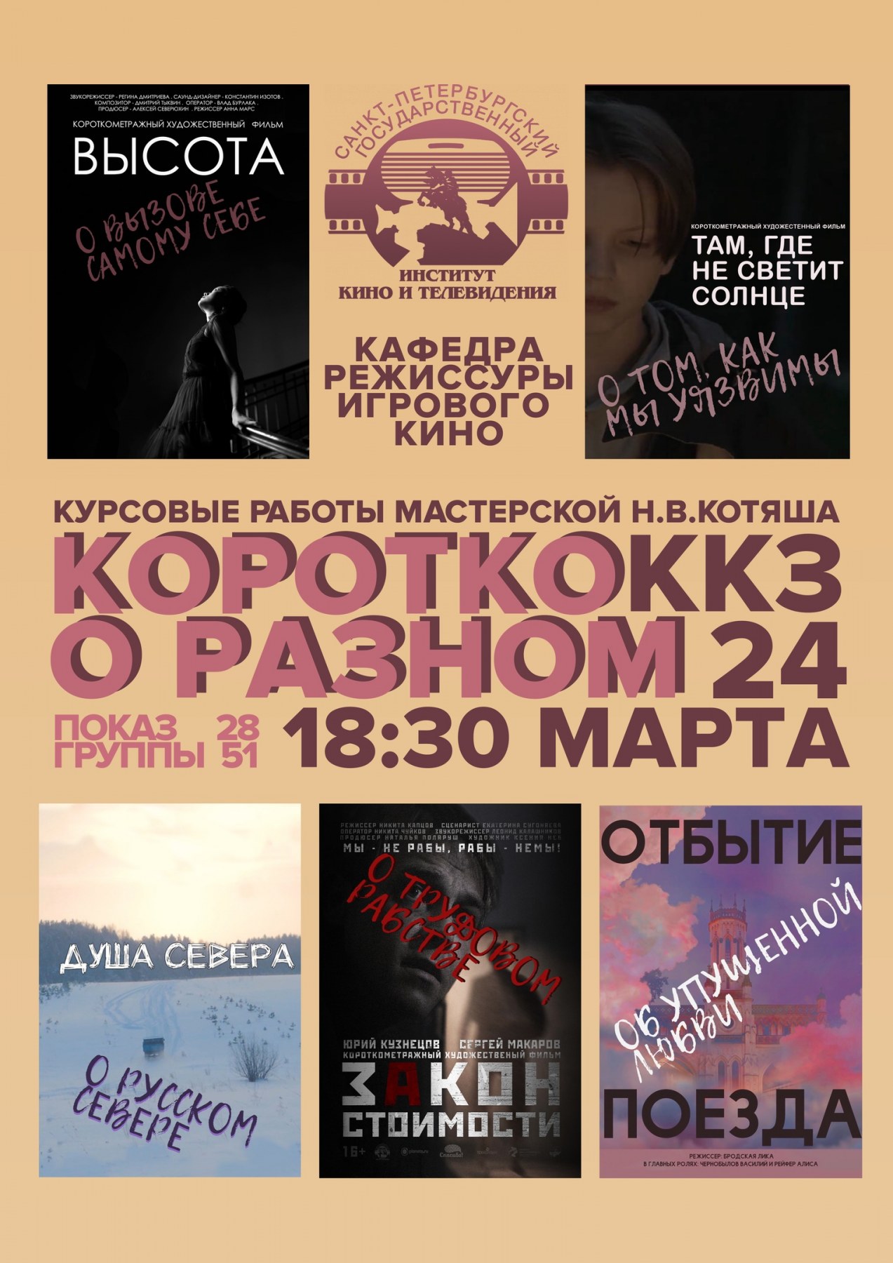 24 марта в киноконцертном зале на Бухарестской состоялся открытый показ курсовых работ «Коротко о разном» студентов группы 2851 кафедры режиссуры игрового кино, мастерской Николая Котяша. Ребята представили публике свои работы, пообщались со зрителями и получили совет от ректора института