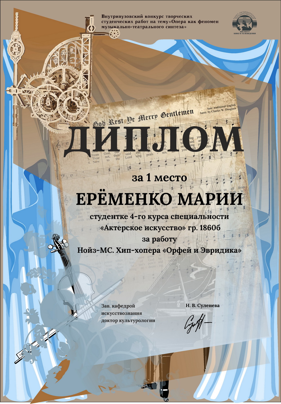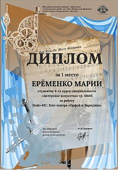 ЕРЁМЕНКО МАРИЯ, студентка 4-го курса специальности «Актерское искусство» (гр. 1860б) за работу: Нойз-МС. Хип-хопера «Орфей и Эвридика»