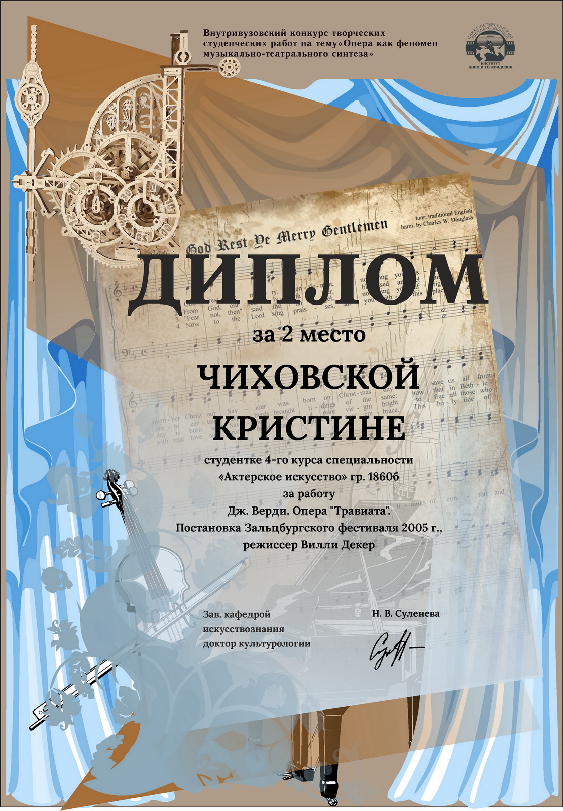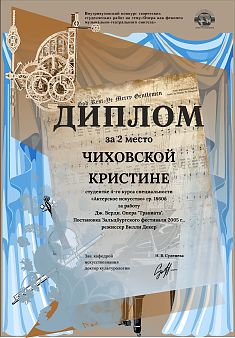 ЧИХОВСКАЯ КРИСТИНА, студентка 4-го курса специальности «Актерское искусство» (гр. 1860б) за работу: Дж. Верди. Опера "Травиата". Постановка Зальцбургского фестиваля 2005 г., режиссер Вилли Декер