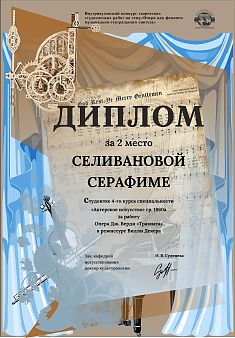 СЕЛИВАНОВА СЕРАФИМА, студентка 4-го курса специальности «Актерское искусство» (гр. 1860а) за работу: Опера Дж. Верди «Травиата» в режиссуре Вилли Декера