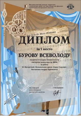 БУРОВ ВСЕВОЛОД, студент 4-го курса специальности «Актерское искусство» (гр. 1860а) за работу: М. Мусоргский. Музыкальная драма «Борис Годунов». Постановка Андрея Тарковского