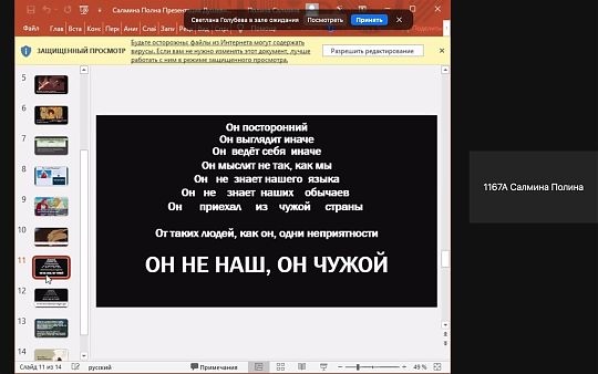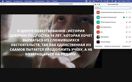 Особенно приятно, что конференция получилась не «чисто студенческая»: преподаватель кафедры канд. филол. наук, доцент Бабурин Лев Константинович также выступил перед студентами с докладом о фильме А.С. Федорченко «Овсянки», где затрагивается проблема возрождения мерянского этноса. Конференция показала, что такой формат проведения очень интересный и продуктивный. Лев Константинович не просто расширил научно-исследовательский кругозор наших студентов, рассказав о концепции этнофутуризма. Доклады преподавателей как более опытных исследователей являются для студентов своеобразным ориентиром, наглядно показывающим, как всесторонне подойти к рассмотрению той или иной проблемы. А студенты, как люди необычайно талантливые и творческие, в свою очередь презентуют такой уникальный материал, что преподаватели открывают для себя много нового и интересного.