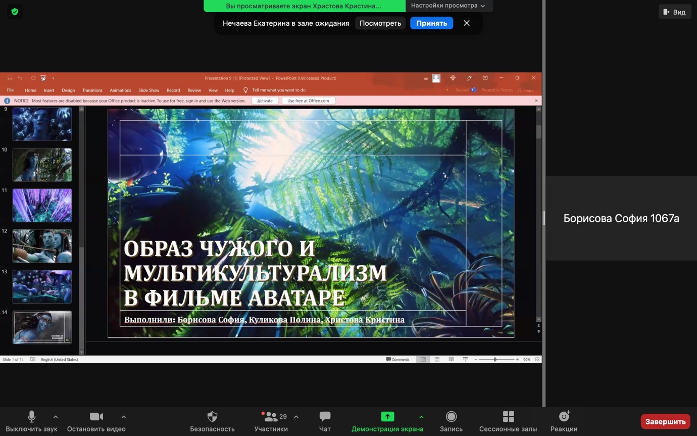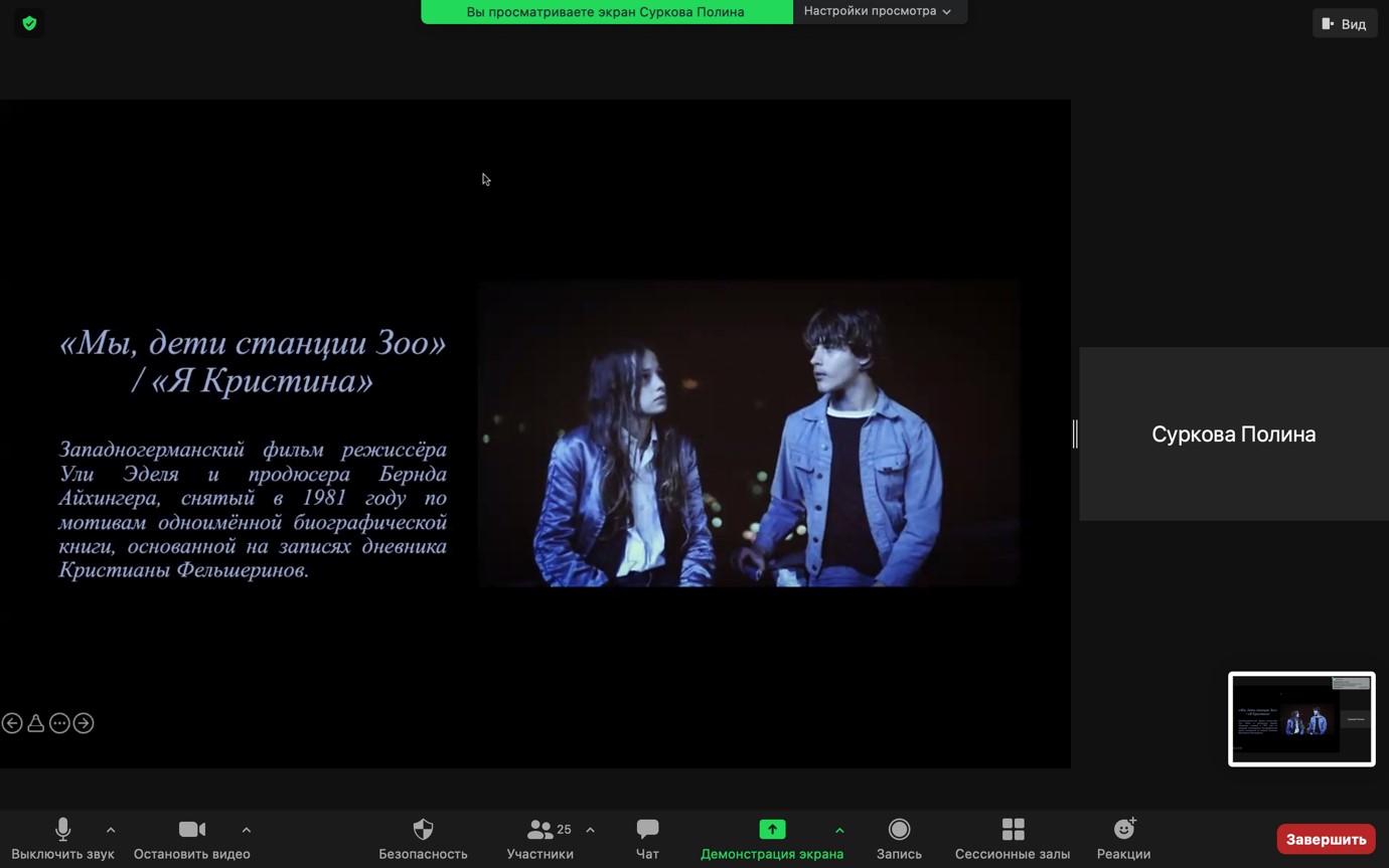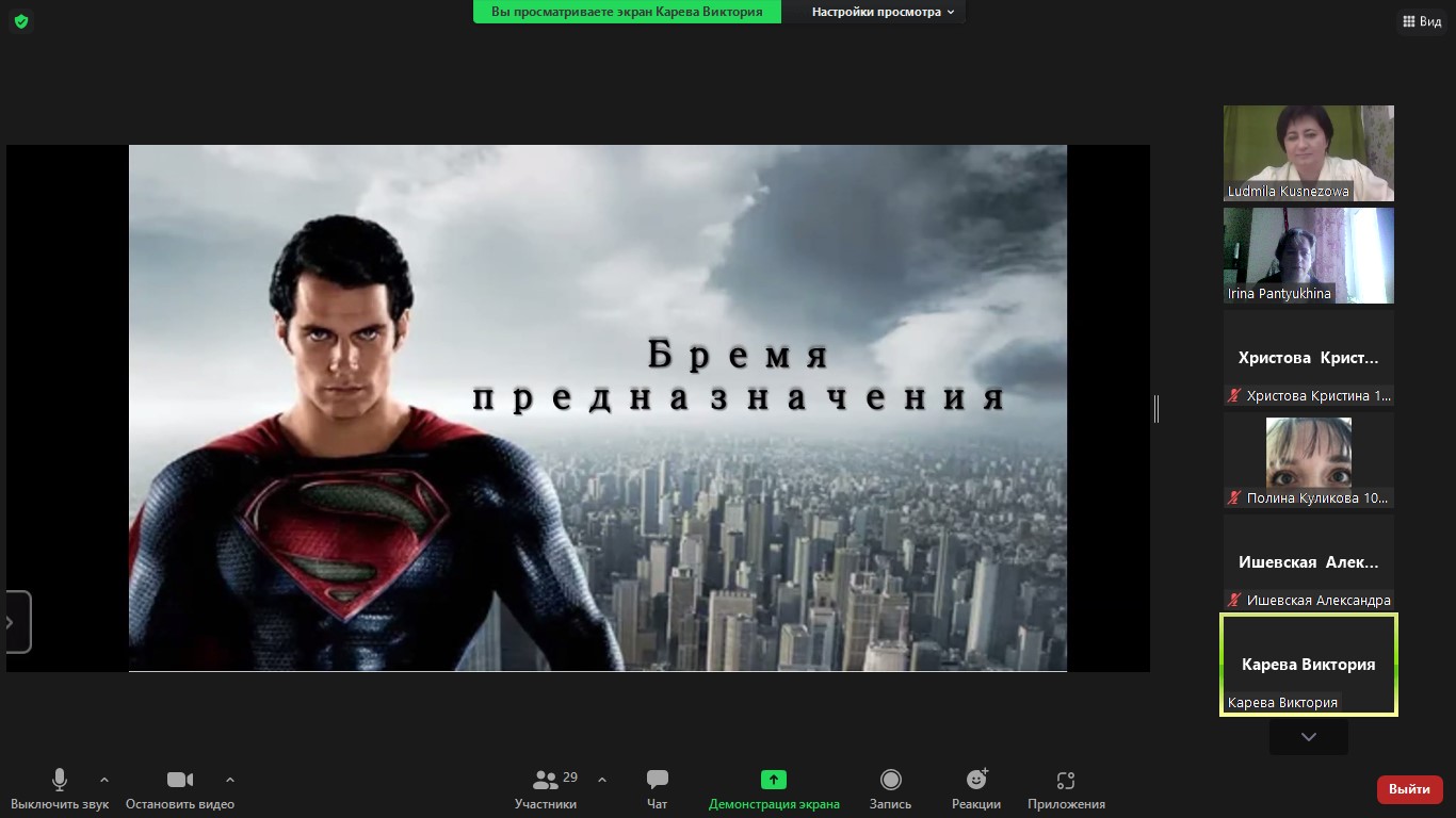 Затронутая тема вызвала настолько живой отклик у наших студентов, что количество заявок превысило все наши ожидания. Спектр докладов получился очень широким – от жанрового многообразия (анимация, комедии, блокбастеры и драмы) до калейдоскопа имен: А. Тарковский, М. Скорсезе, Дж. Кэмерон, Ф. Акин, Т. Тыквер, Дж. Пил, З. Снайдер и др.