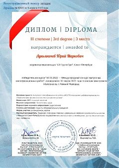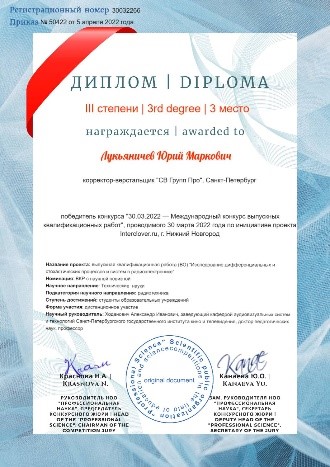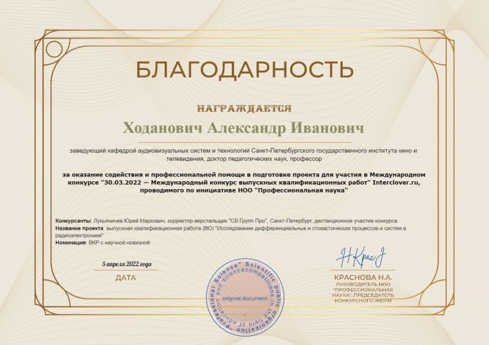 Лауреатом конкурса с дипломом III степени стал выпускник гр. 1734 факультета телевидения, дизайна и фотографии Санкт-Петербургского государственного института кино и телевидения Лукьяничев Юрий Маркович с выпускной квалификационной работой "Исследование дифференциальных и стохастических процессов и систем в радиоэлектронике" (рук. проф. А.И. Ходанович), направление подготовки 11.03.01- Радиотехника, номинация- выпускная квалификационная работа с научной новизной.