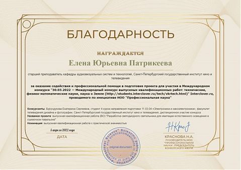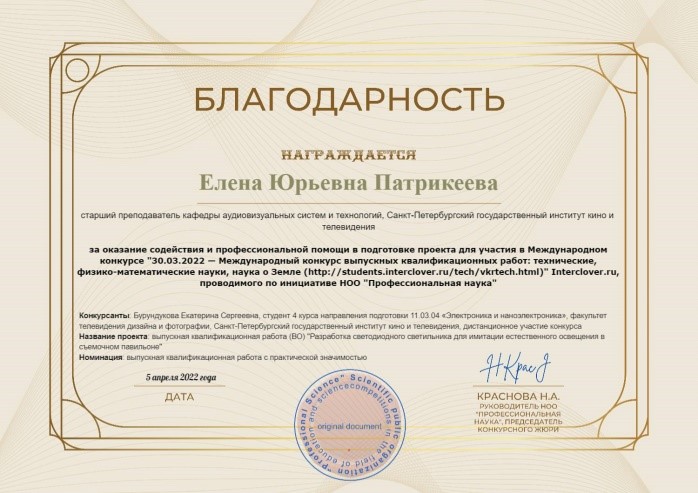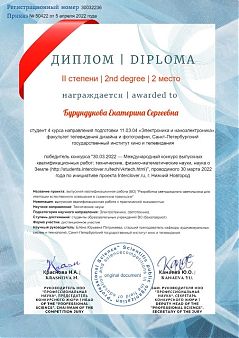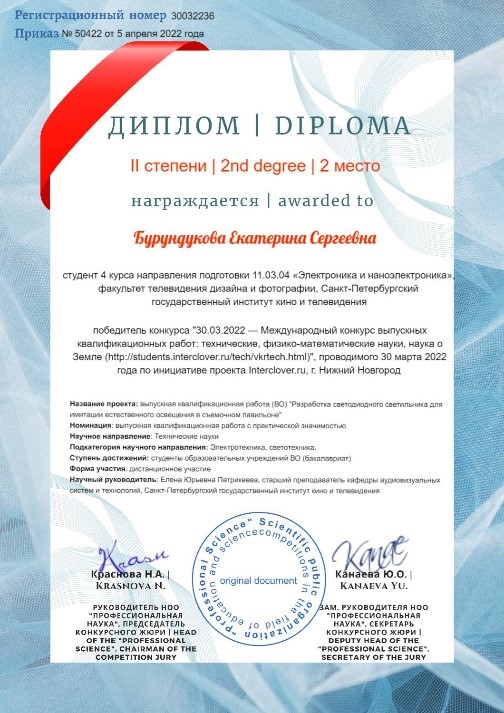 В номинации «Выпускная квалификационная работа с практической значимостью» лауреатом Конкурса с дипломом II степени стала выпускница гр. 1822 факультета телевидения, дизайна и фотографии Санкт-Петербургского государственного института кино и телевидения Бурундукова Екатерина Сергеевна с выпускной квалификационной работой "Разработка светодиодного светильника для имитации естественного освещения в съемочном павильоне" (рук. ст. преподаватель Е.Ю. Патрикеева), направление подготовки 11.03.04 - Электроника и наноэлектроника.