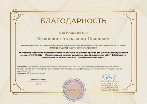 30.03.2022 г. состоялся Международный конкурс выпускных квалификационных работ Interclover.ru, проводимый по инициативе НОО "Профессиональная наука".