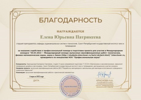 Научные руководители лауреатов проф. А.И. Ходанович и ст. преподаватель Е.Ю. Патрикеева награждены Благодарностью от руководства НОО «Профессиональная наука» за оказание содействия и профессиональной помощи в подготовке проекта для участия в Международном конкурсе выпускных квалификационных работ.