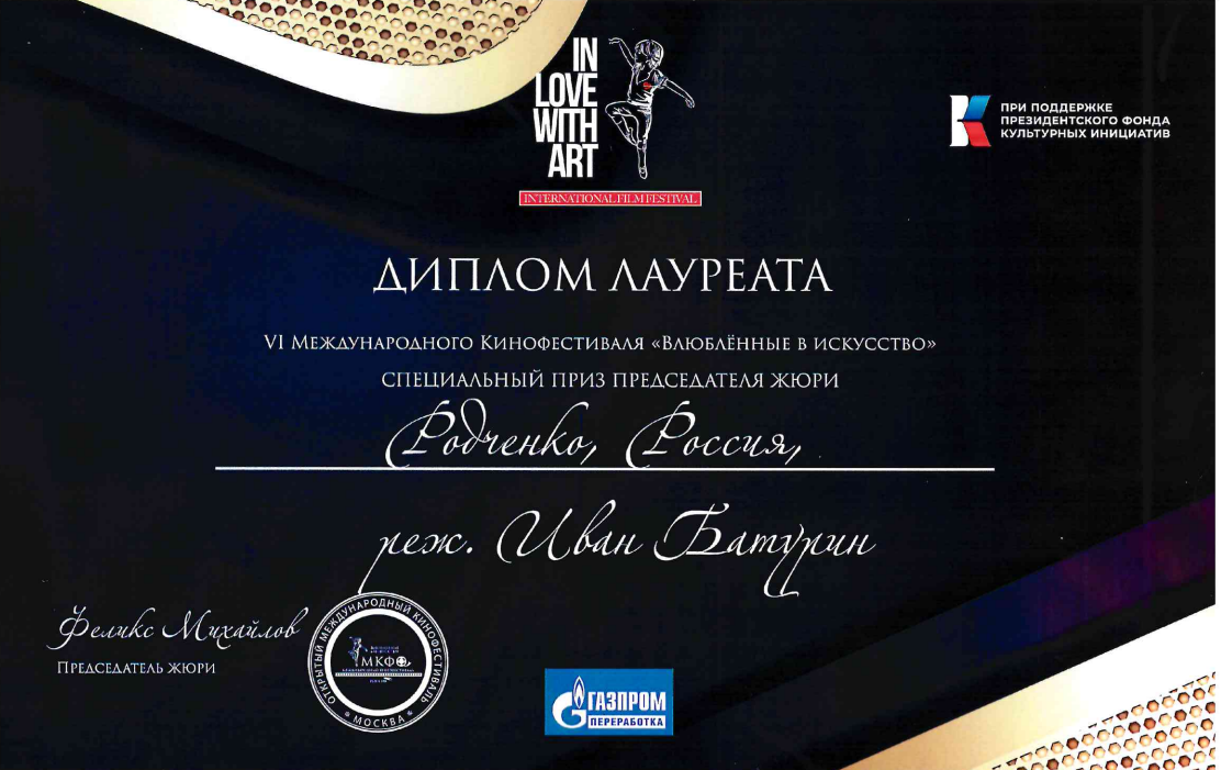 На VI Международном кинофестивале "Влюблённые в искусство" фильм режиссёра Ивана Батурина "Родчеко" (мастерская В.И.Гуркаленко и М.Ю.Морозовой)