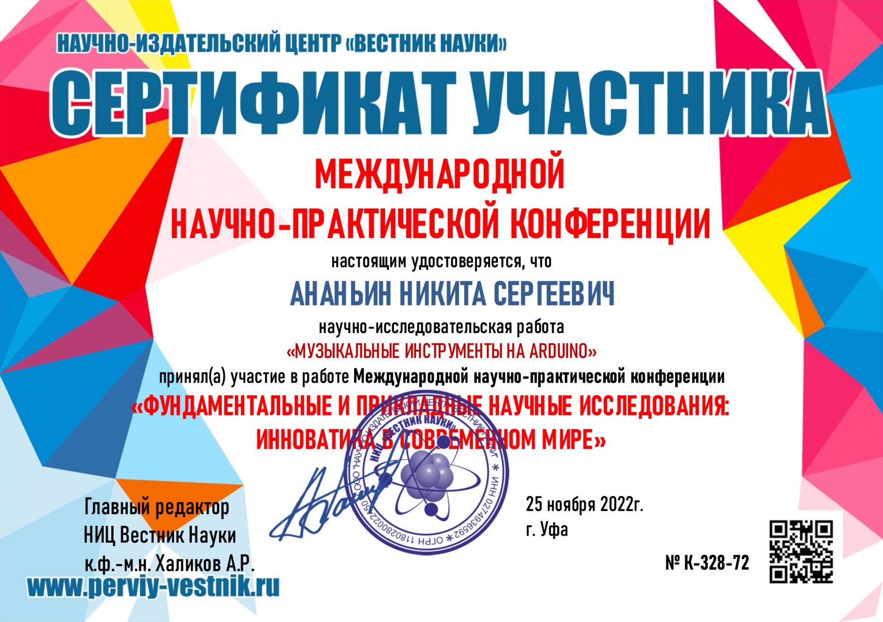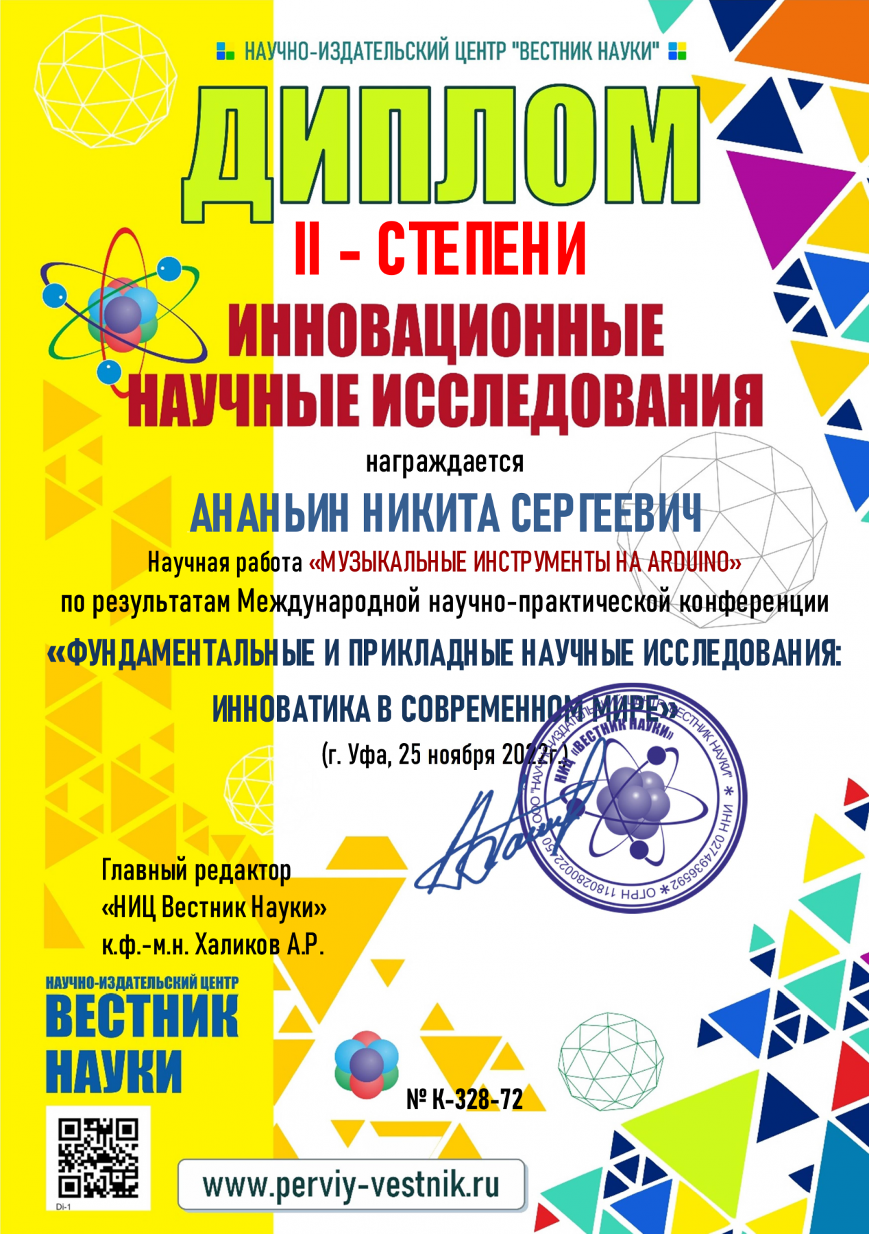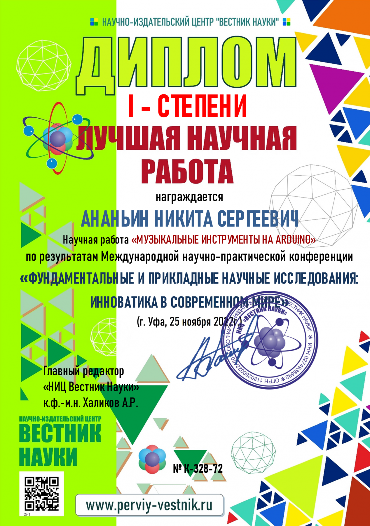 Диплом I степени - лучшая научная работа "Музыкальные инструменты на ARDUINO" по результатам Международной научно-практической конференции "Фундаментальные и прикладные научные исследования: инноватика в современном мире". Уфа, 25.11.22