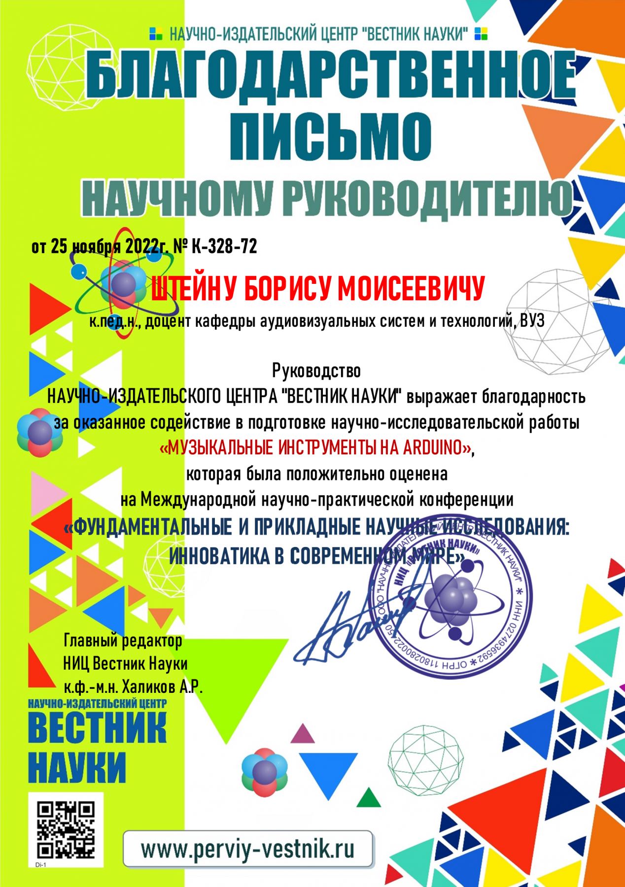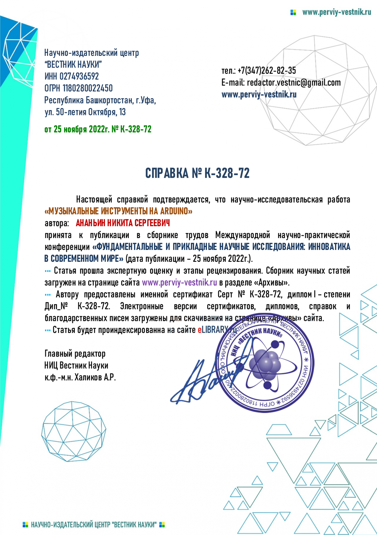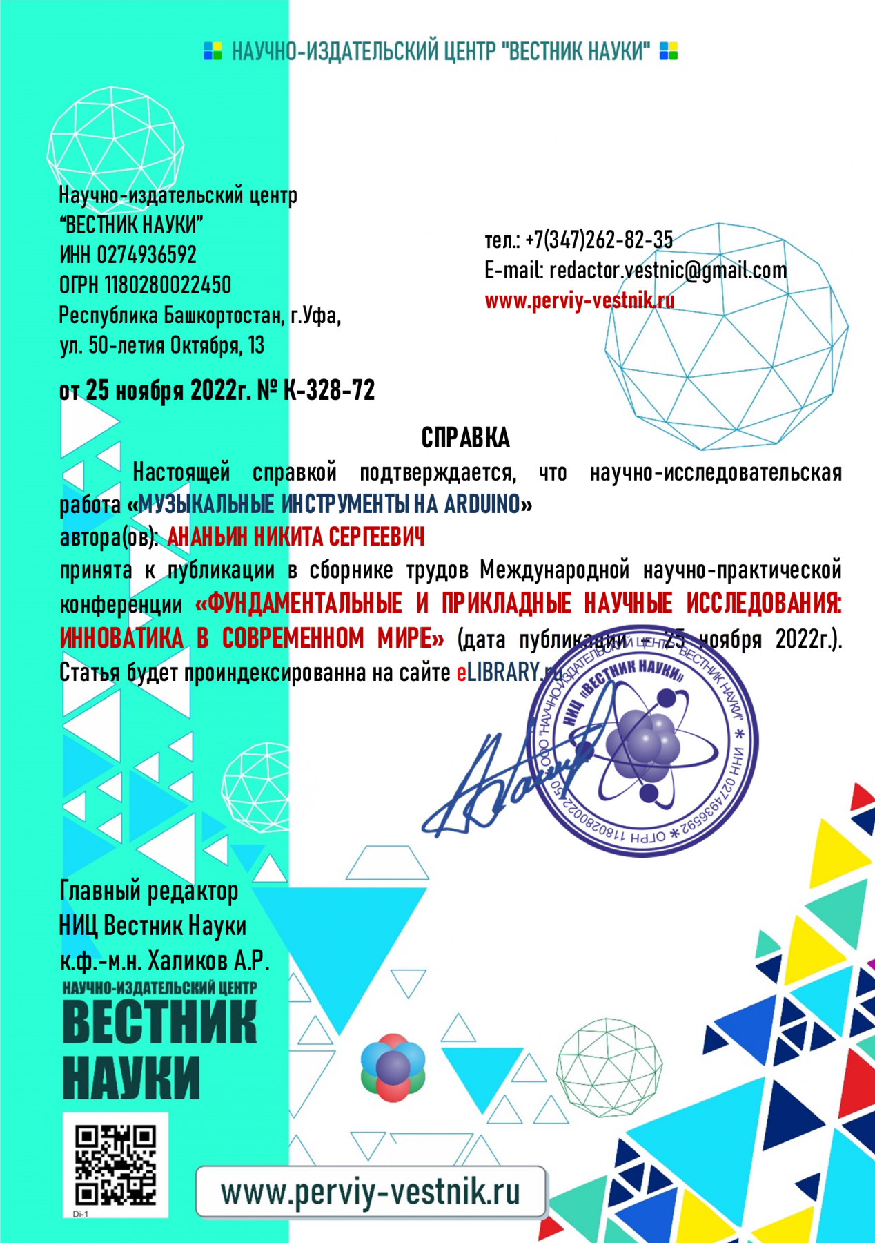 Диплом I степени - лучшая научная работа "Музыкальные инструменты на ARDUINO" по результатам Международной научно-практической конференции "Фундаментальные и прикладные научные исследования: инноватика в современном мире". Уфа, 25.11.22