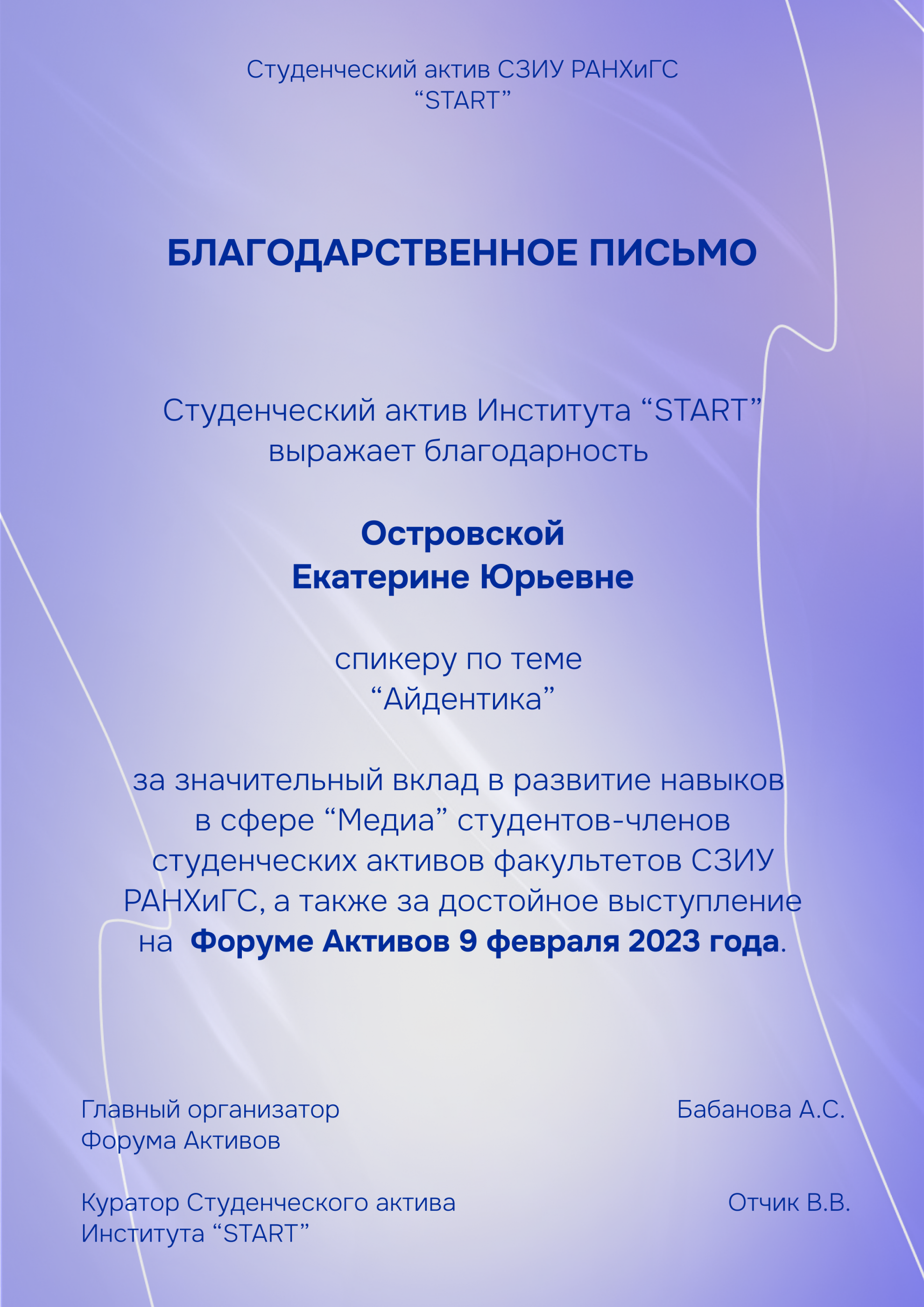 Злата уже четыре года развивает себя в активистской и лидерской деятельности. Выпускница Российского движения школьников в Санкт-Петербурге, в 2021 году была награждена «Звездой Артека» (общеартековский конкурс за высокие личные достижения, активное участие в программах детского центра, креативность, лидерство, уважение к сверстникам и артековскому сообществу), а в настоящее время руководит информационной деятельностью «Навигаторов Детства» в Санкт-Петербурге, а также руководит детским региональным медиацентром «ПитерМедиа». На встрече Злата рассказала студентам о том, как развивать в себе лидерские качества и провела нетворкинг-сессию.