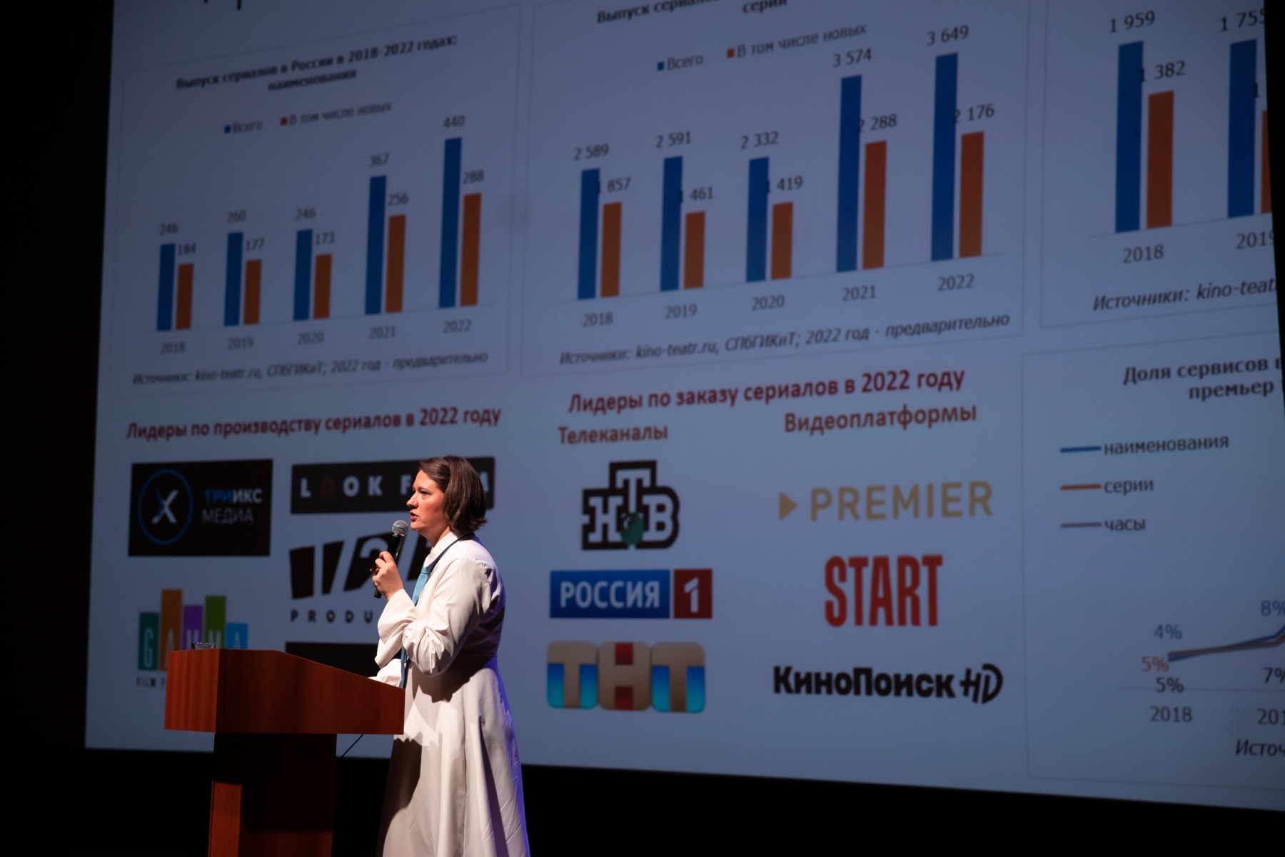 О российской киноиндустрии 2022 года рассказала Ксения Леонтьева, кандидат экономический наук, доцент кафедры продюсирования кино и телевидения СПбГИКиТ. Докладчик поделилась данными о лидерах проката, тенденциях киноиндустрии и трендах кинопроизводителей.