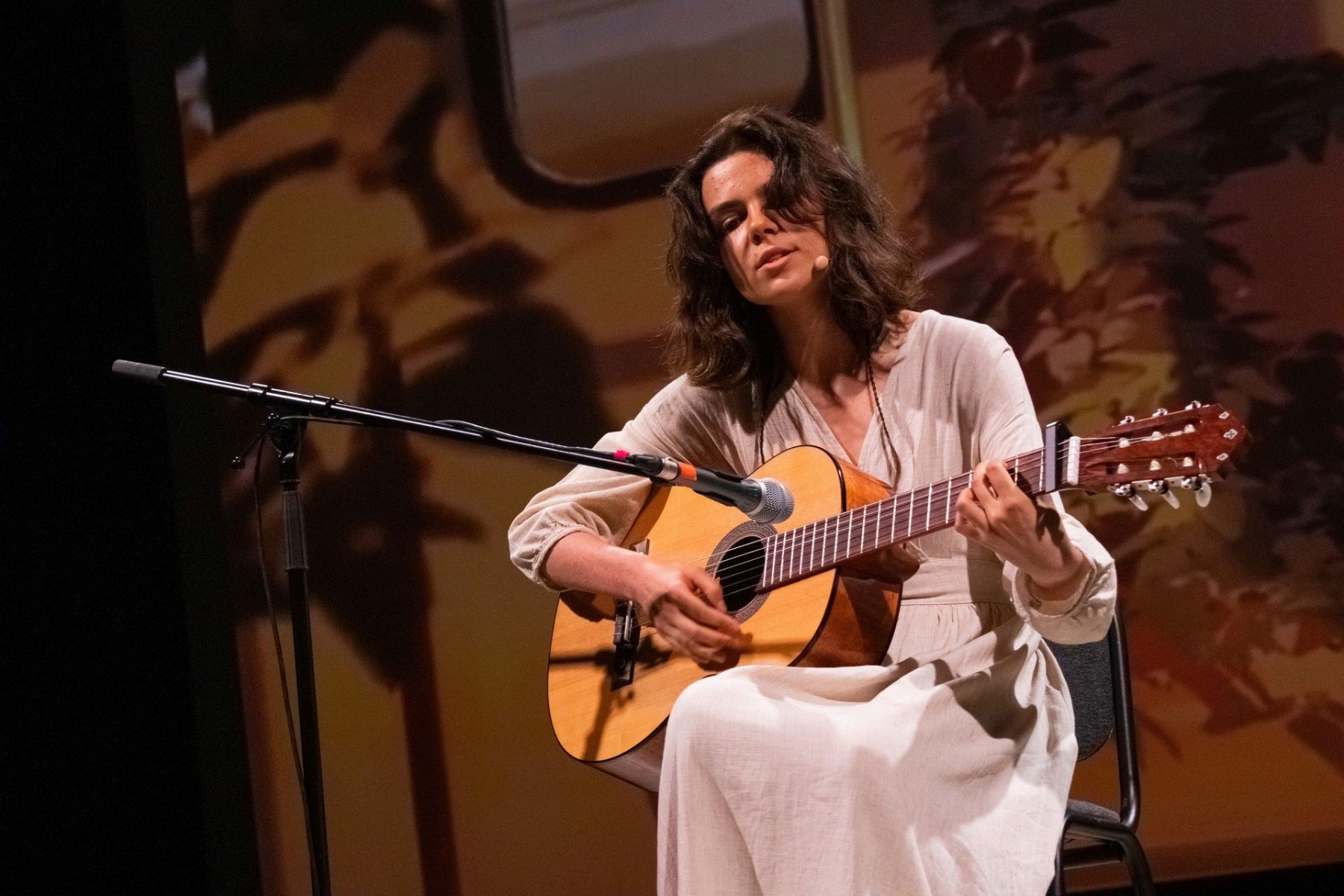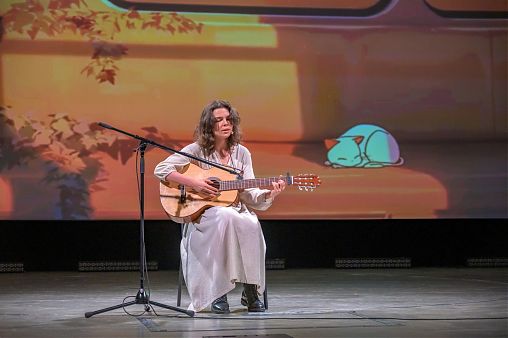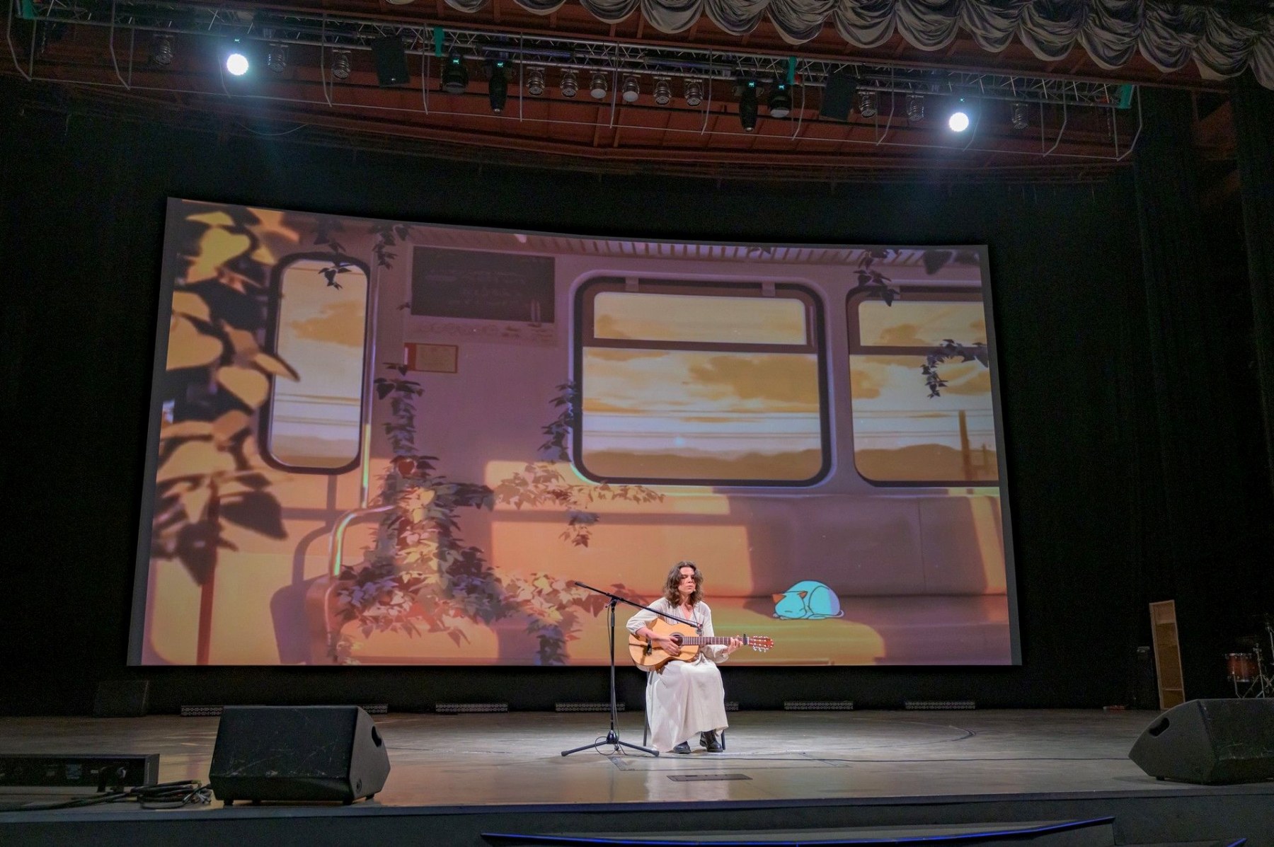 А студентка 4 курса Алина Хардина выступила с вокально-графической композицией на песню "500 miles" группы "Peter, Paul & Mary".