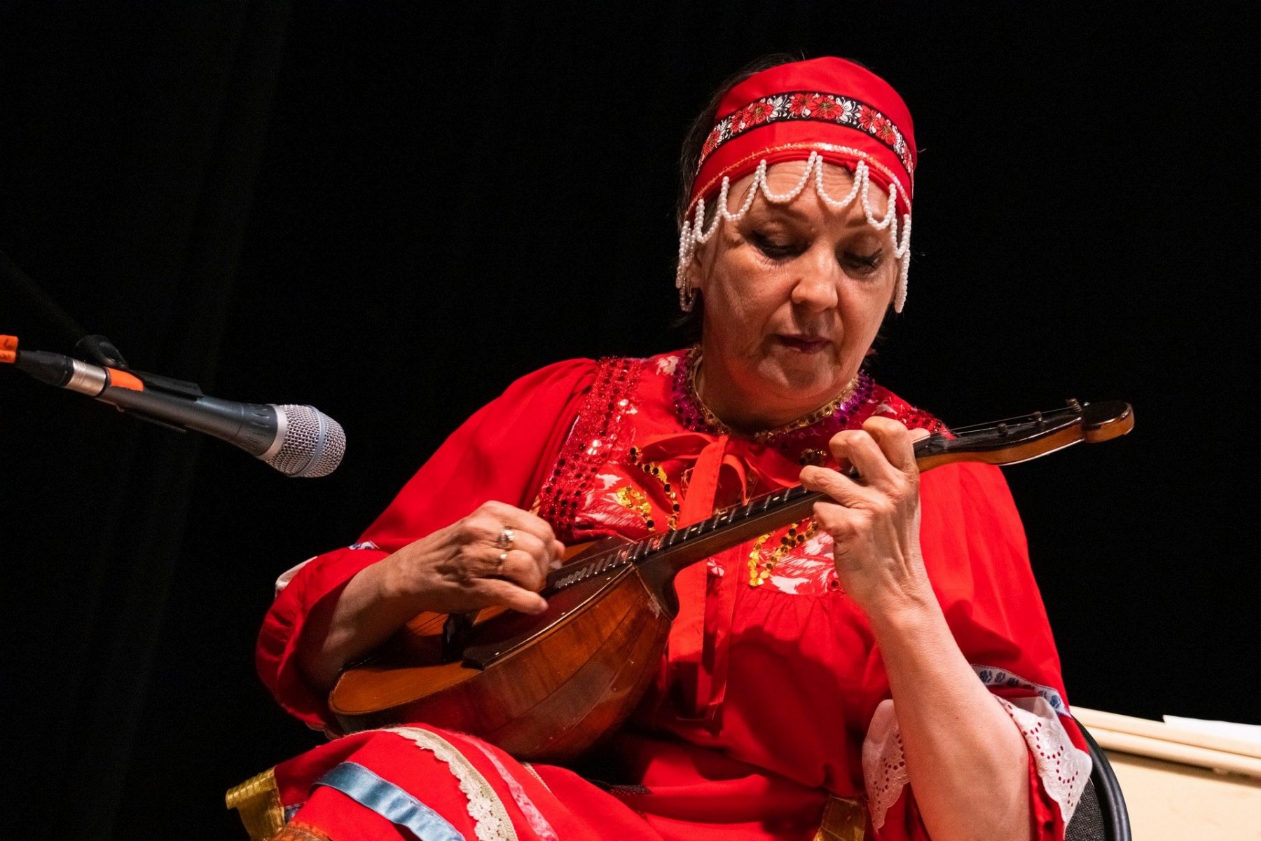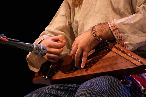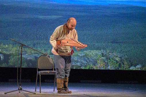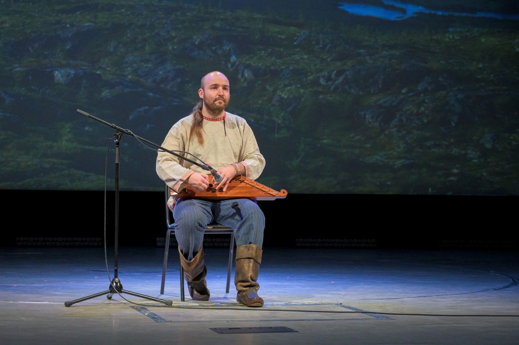 Карельскую тему продолжил музыкант Сергей Олегович Карпов, выступивший с музыкальной композицией на очень необычном карело-финском инструменте "кантеле", отчасти напоминающем гусли.