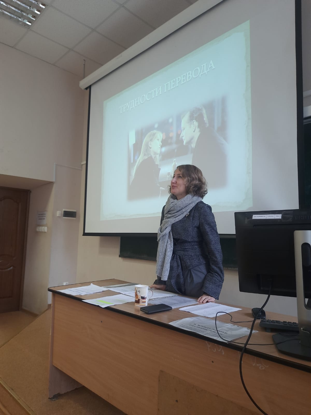 Доцент кафедры иностранных языков Максимова Е.Е. рассказала слушателям о критериях качества художественного перевода, основных задачах переводчика, лингвистических и экстралингвистических нюансах, знание которых облегчает работу над переводом. Так, участники обсудили проблему выбора лексического соответствия, необходимость переводческих трансформаций, способы передачи идиоматичности и стилистических приемов, а главное, попытались осмыслить сверхзадачу сохранения авторского замысла, как недостижимый для переводчика идеал.